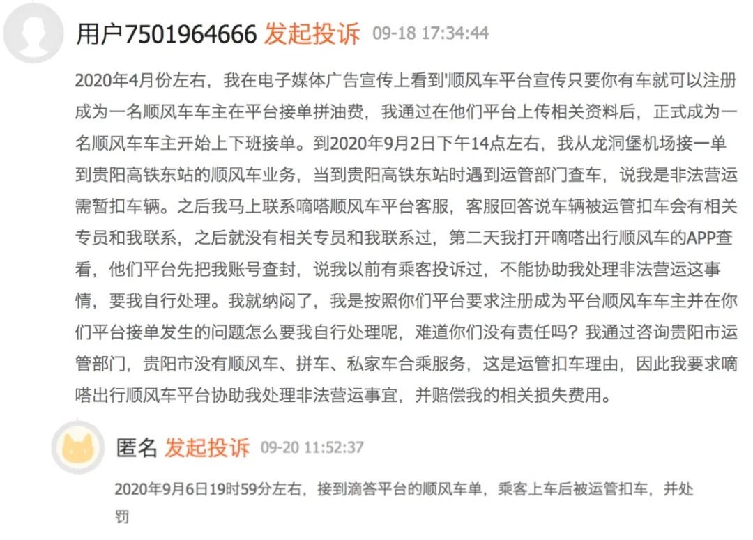 此外,据黑猫投诉,贵阳一顺风车车主投诉称,今年9月2日,其按照嘀嗒平台正常接顺风车单,但是当地运管部门称属于非法营运车辆,并且扣押了该司机车辆,嘀嗒当时并未协助司机处理后续事宜。