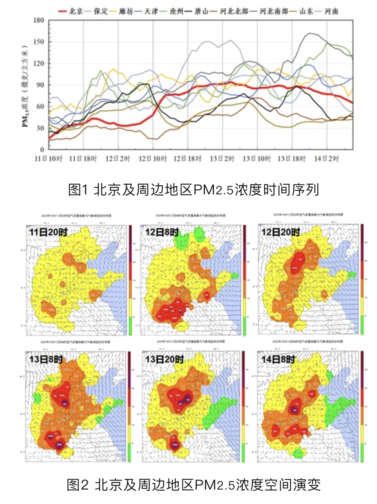 据介绍,从11日起,大气扩散条件转不利,区域污染开始积累。11日污染最初发生于区域南部地区,在偏南风作用下,京津冀区域浓度有所抬升,夜间河北中南部达到3级轻度污染,北京近周边以2级良为主。12日,在偏东风作用下,太行山前出现一条轻度污染为主的污染带并维持,13日污染带北部的北京及周边廊坊-天津保持轻度污染,中南部保定-石家庄-邢台部分时段达到中重度污染。14日上午,受西北弱高压影响,北京和保定西部污染有所减轻,其他区域污染仍维持,河南中部、河北南部和东部达到4级中度以上污染水平。北京12日白天PM2.5快速抬升至3级轻度污染,之后浓度维持相对稳定水平,峰值出现在13日4时,为94微克/立方米。