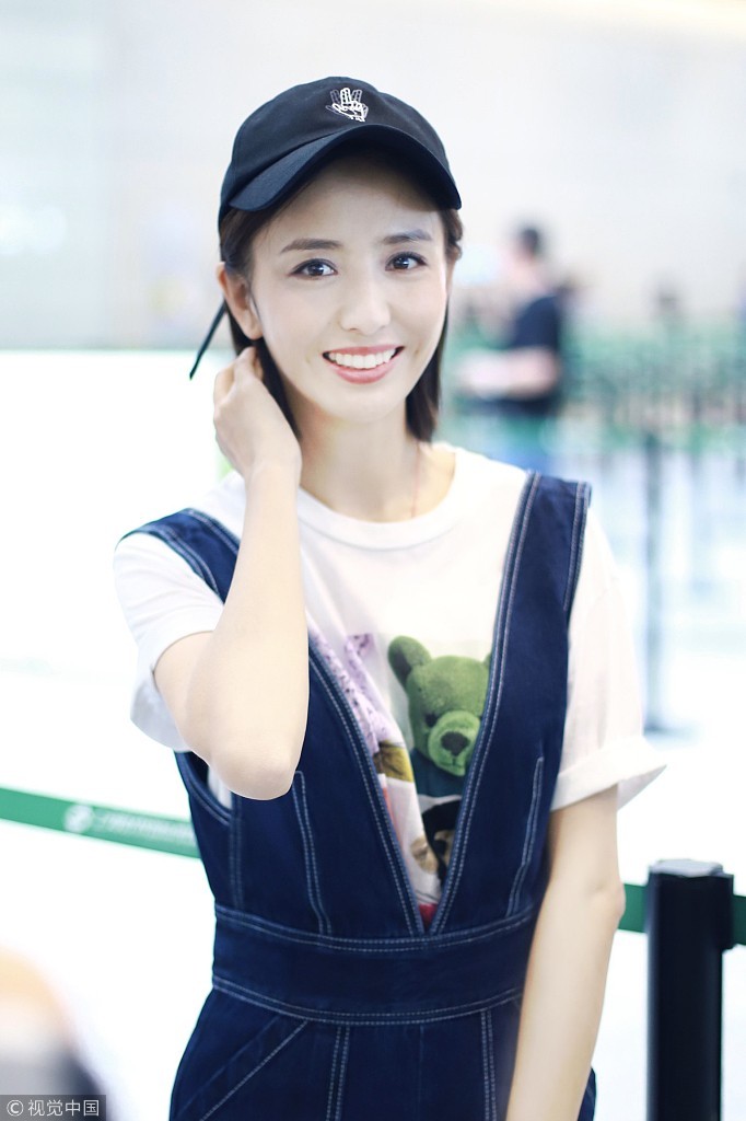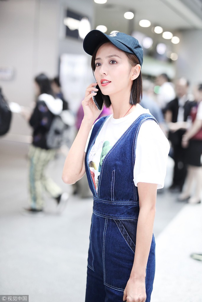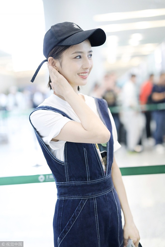 她身穿T恤搭配牛仔背带裤造型阳光有活力,恢复短发造型戴棒球帽,侧脸颜值吸睛。