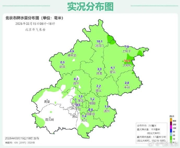 受冷空气和偏南暖湿气流的共同影响,今天京城雪花持续派送,一时间大如鹅毛般纷飞。3月15日8时至18时全市平均降水量2.0毫米,城区平均0.8毫米,西北部1.6毫米,西南部0.1毫米,东北部4.6毫米,东南部0.9毫米。最大降水量出现在密云大岭村16.9毫米,最近一小时最大降水量为平谷东高村2.0毫米。延庆、怀柔、密云、平谷已发布道路结冰黄色预警信号。