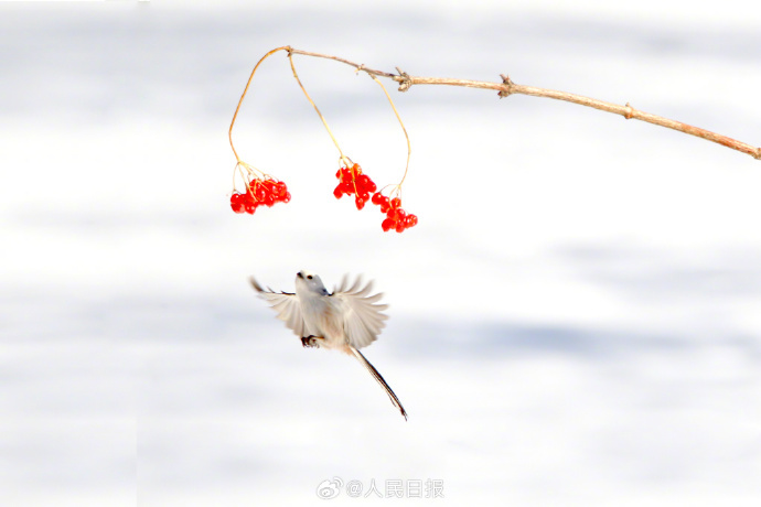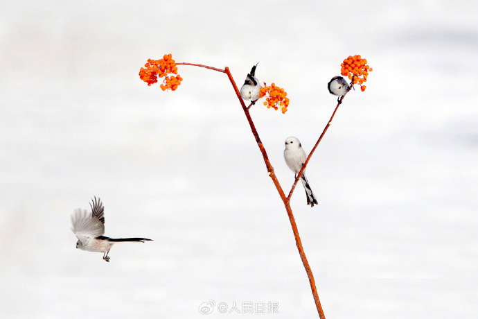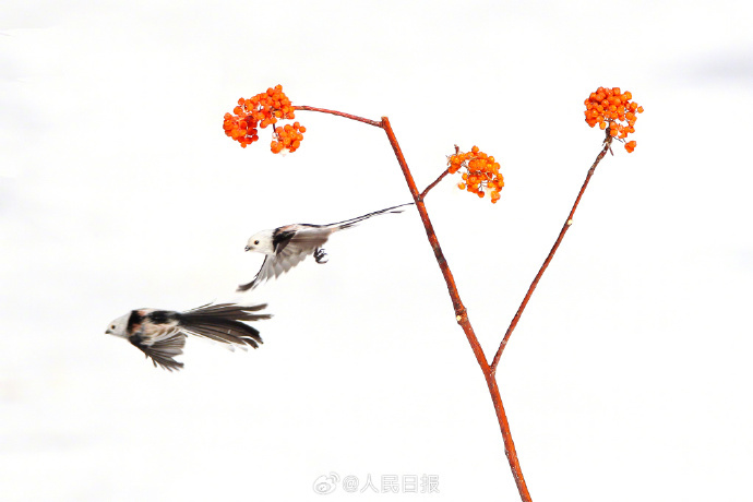 近日,黑龙江大庆城市森林公园雪地林间,小鸟在枝头嬉戏,画面灵动可爱。网友:好像是花鸟图照进了现实!