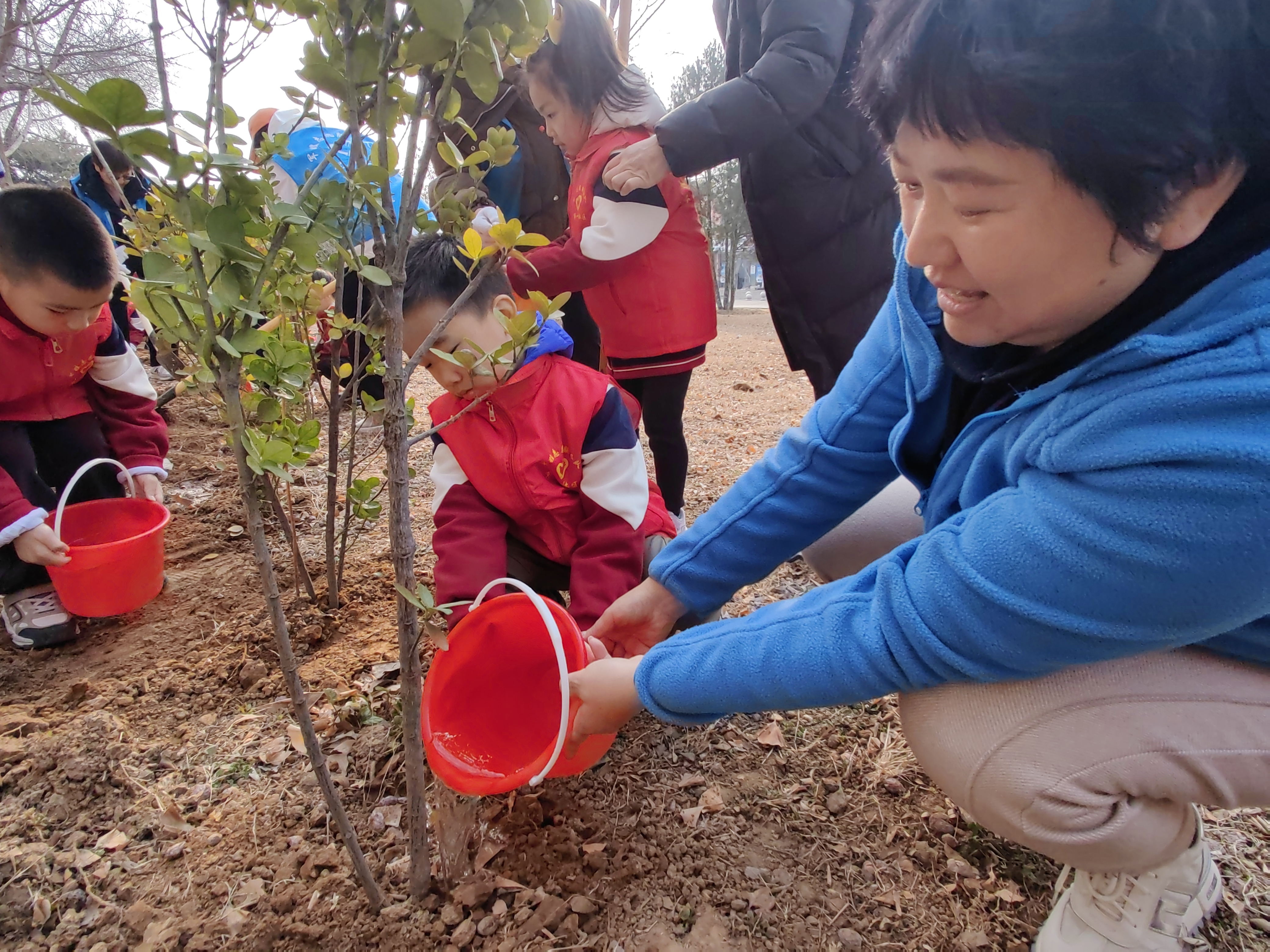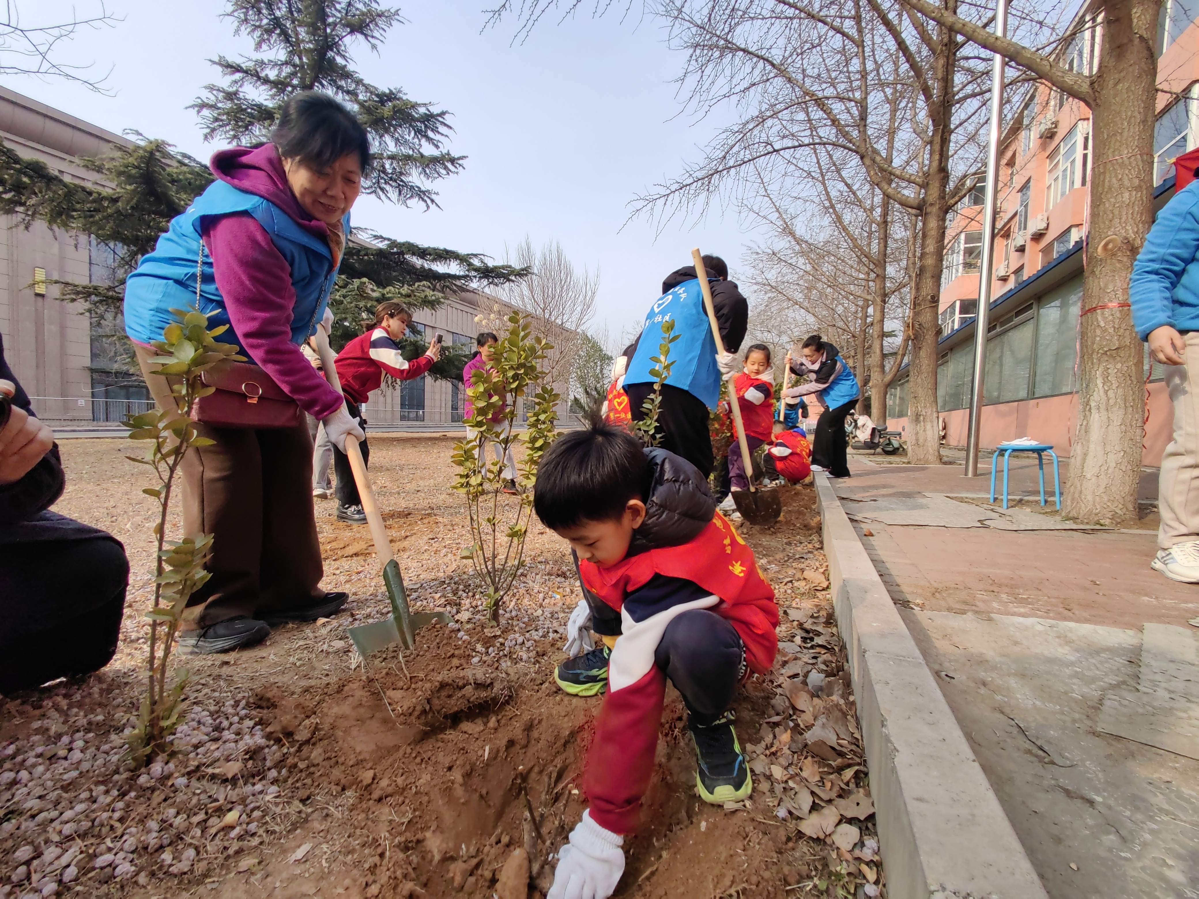 随着植树活动正式开始,现场立刻呈现出一派热火朝天的劳动景象。青鸽军嫂志愿者们化身“绿色使者”,主动扛起铁锹、拎起水桶,弯腰培土、扶正树苗,动作娴熟利落。青柠军娃志愿者们有的小心翼翼扶着树苗,有的踮起脚尖帮忙填土,还有的提着小水桶认真浇水,稚嫩的身影穿梭在树苗之间,小手虽小,却充满力量。大手牵小手,分工协作、默契配合,从挖坑整地到栽苗覆土,再到浇水定根,每一道工序都做得一丝不苟、井然有序。