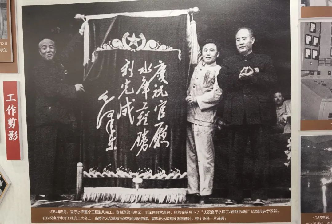 在官厅水库展览室,记者看到了1954年5月庆祝官厅水库工程竣工时毛泽东主席题词的“庆祝官厅水库工程胜利完成”锦旗。老人回忆,官厅水库光荣的历史,不仅是北京、河北,更是全国人民的官厅。“鞍山的钢铁,天津、太原、上海的钢筋,唐山的水泥,内蒙的木材……”建设者工人、农民、退伍军人、学生们也来自全国各地,爬坡过坎、攀梯下沟,历时2年零6个月建成。