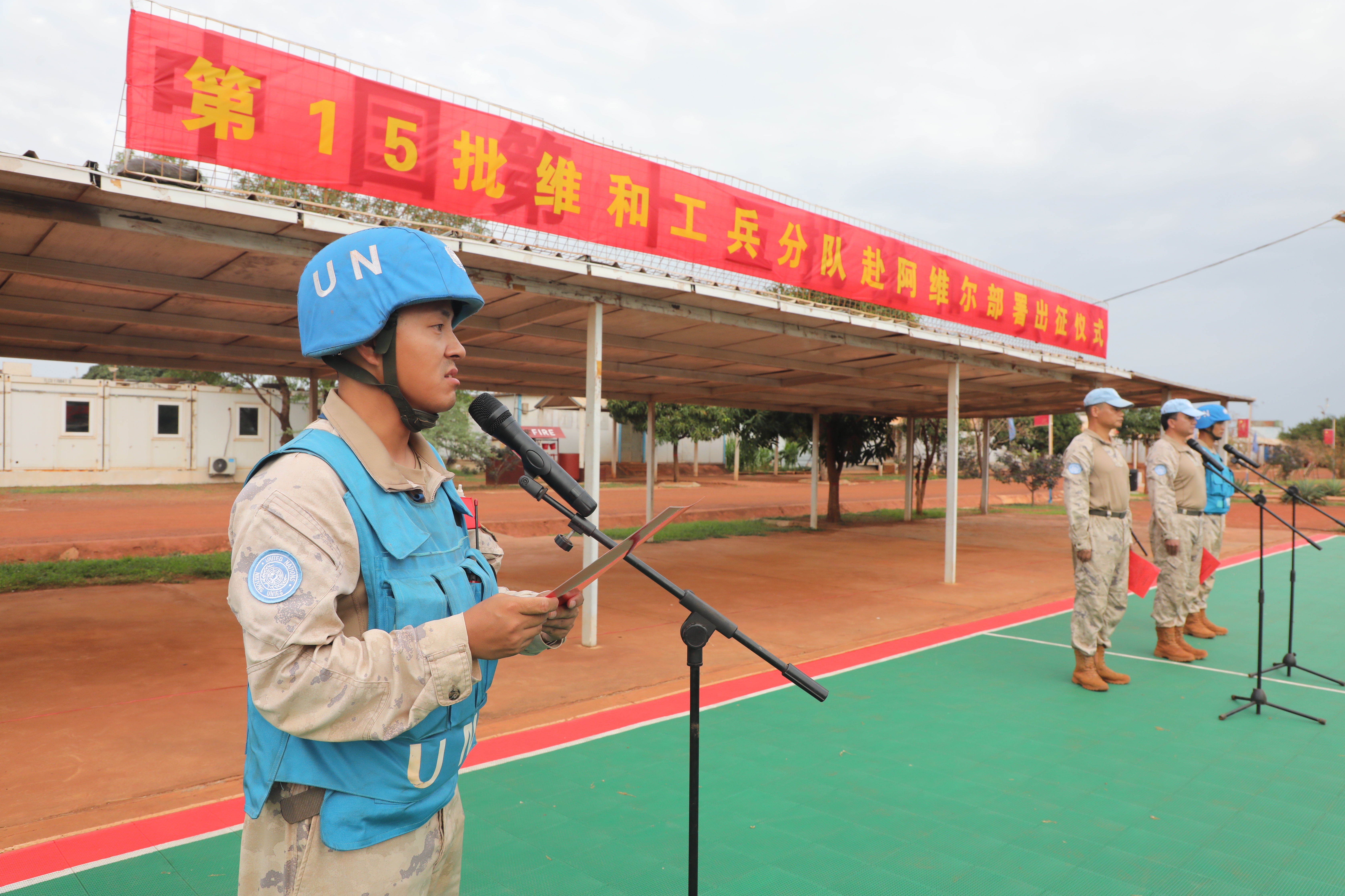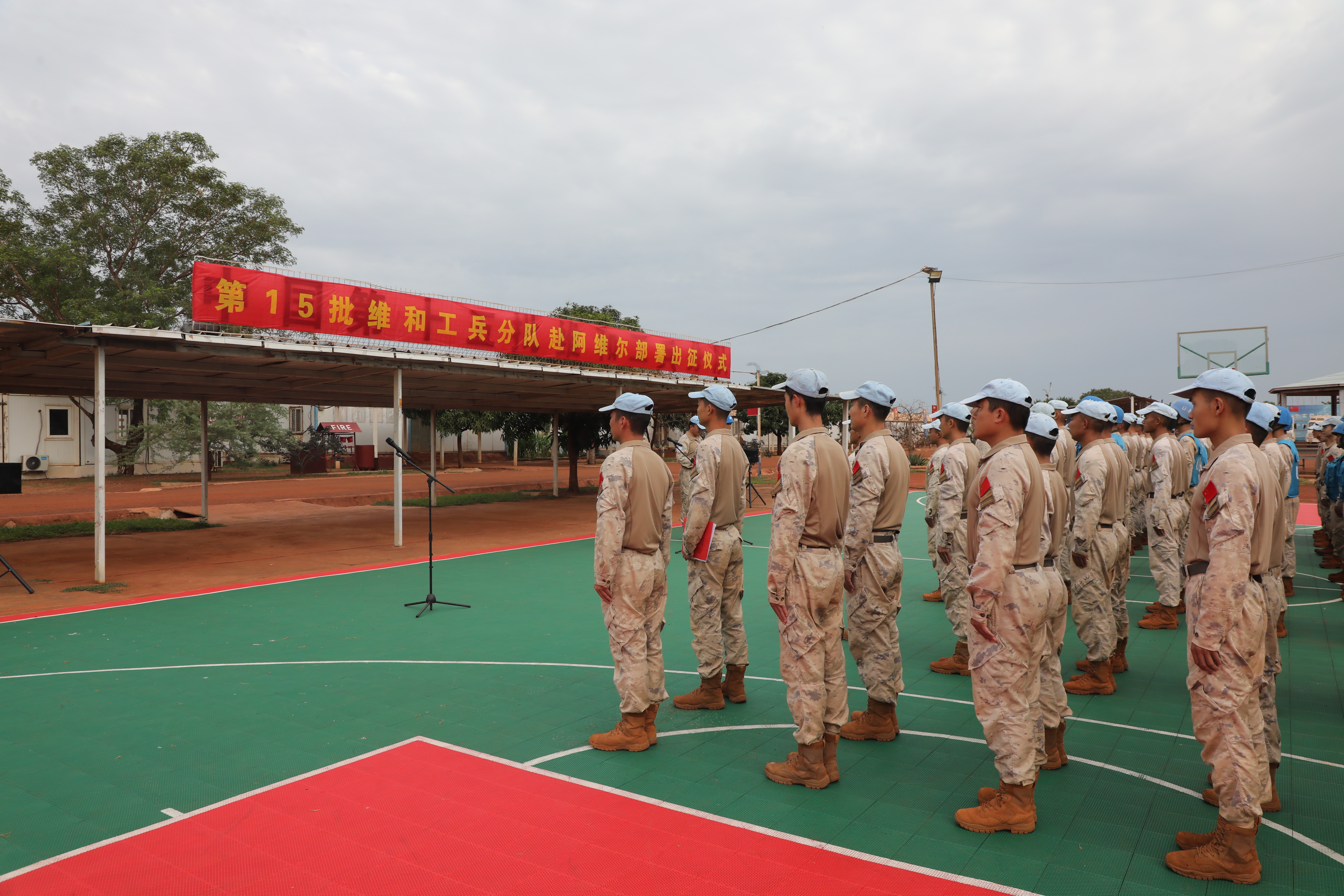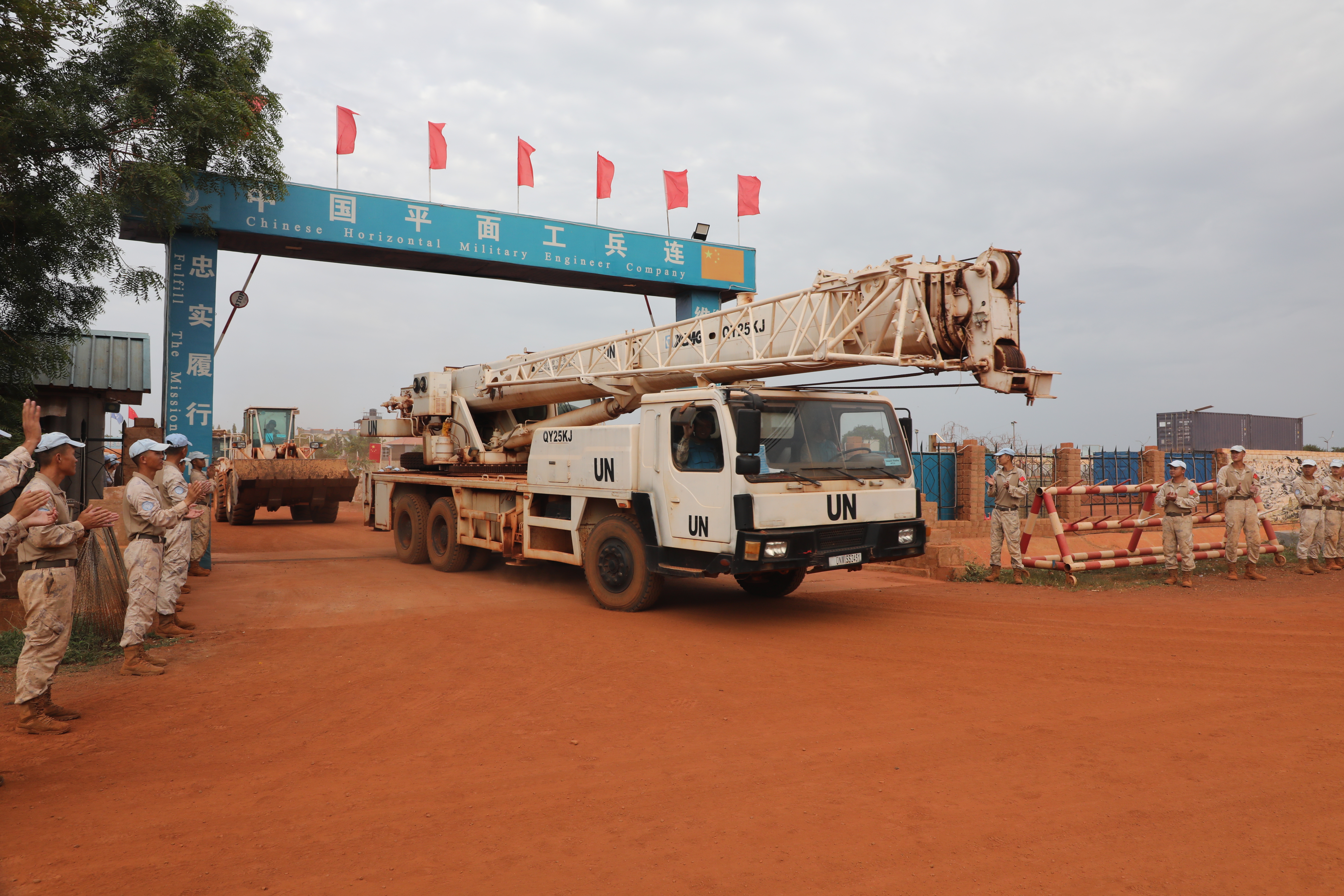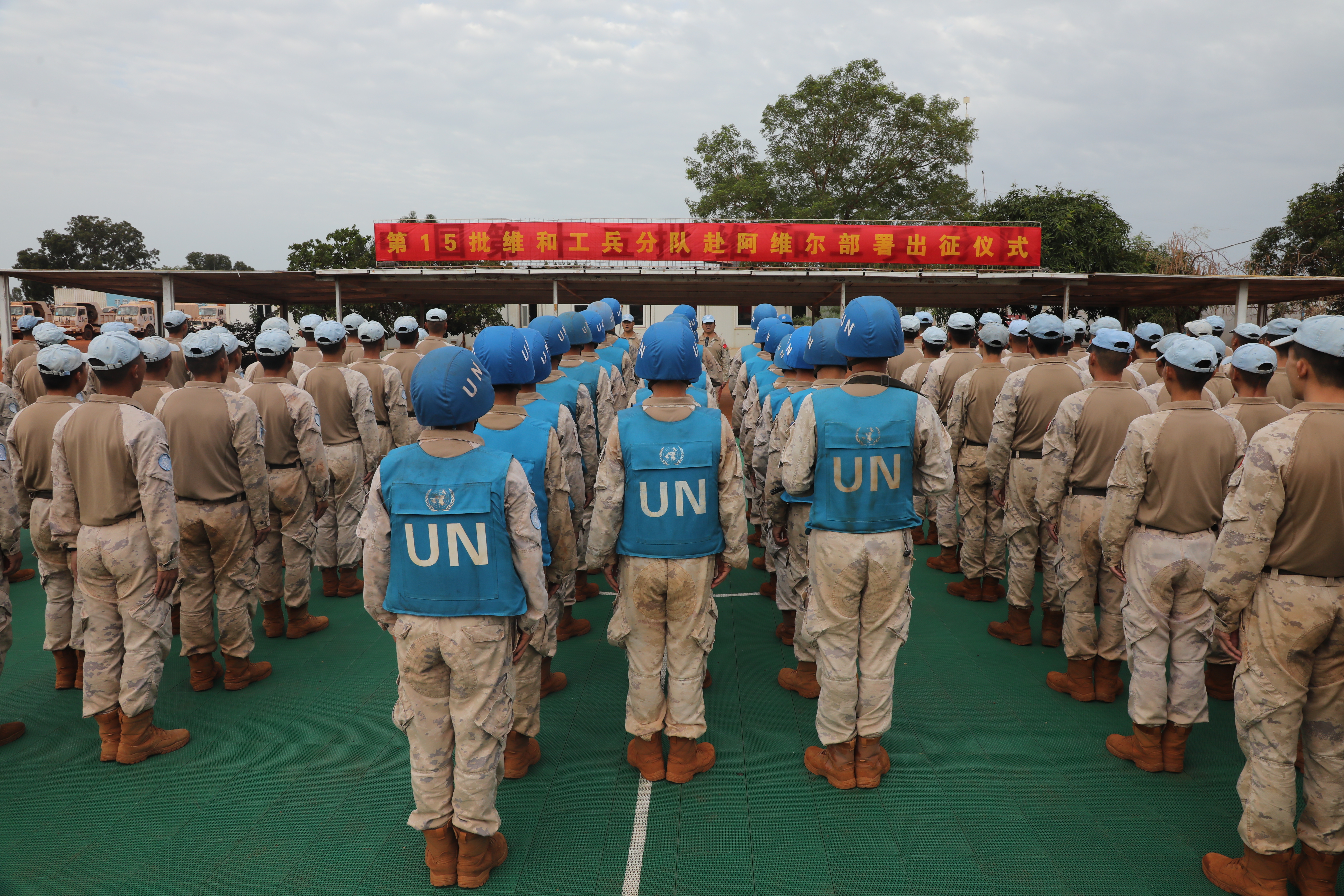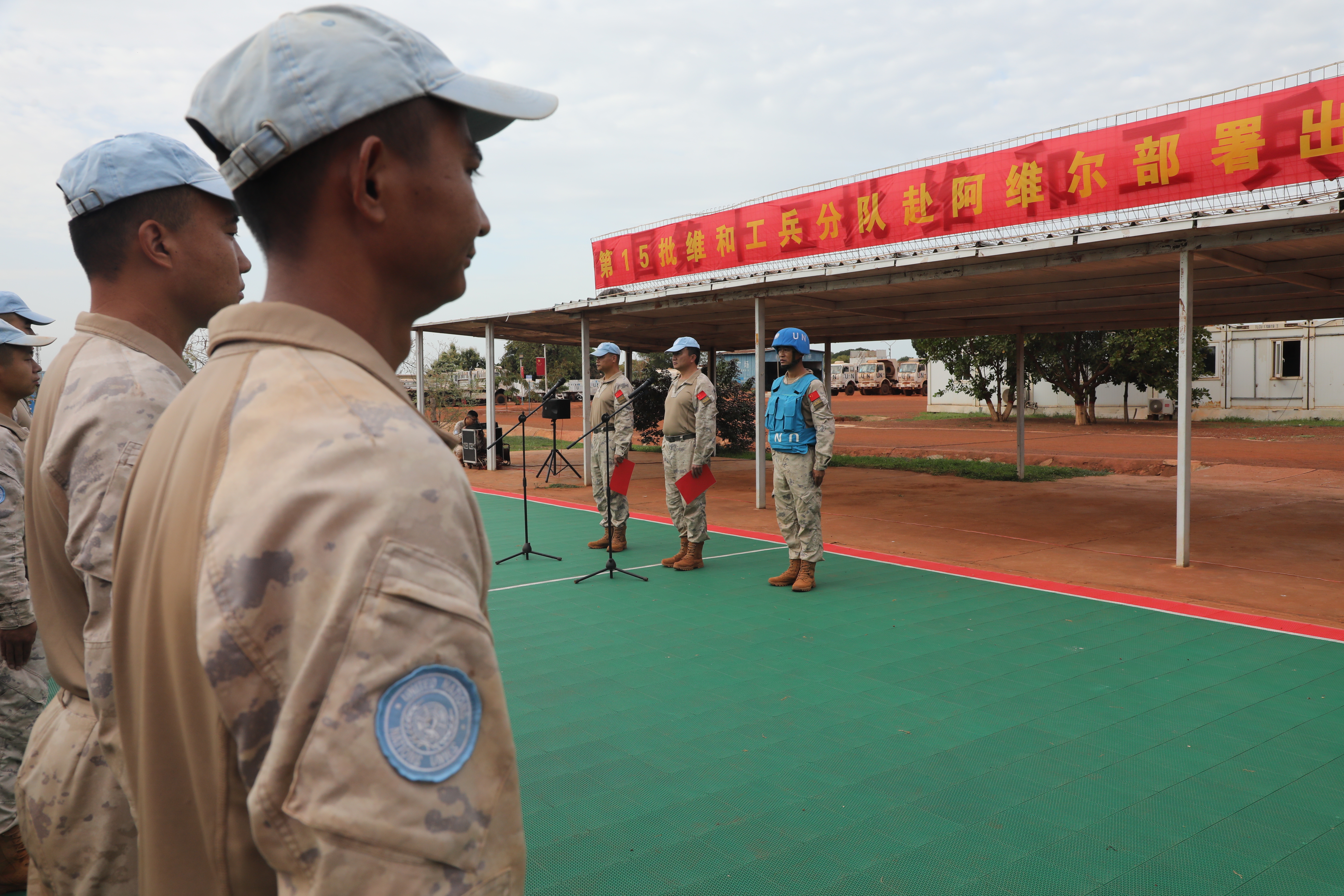 当地时间6月3日,中国第15批赴南苏丹(瓦乌)维和工兵分队25名官兵奔赴阿维尔基地进行部署,主要担负修建机场跑道、避难所、弹药库和硬化场地、挖设排水系统等相关工程保障任务。