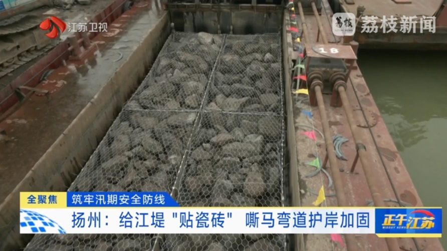防汛工作是守护民生的大事,连日来,扬州防汛部门加快水利设施建设,全力以赴做好各项防御工作。今天(5月24日),江苏卫视《正午江苏》以《筑牢汛期安全防线 扬州:给江堤“贴瓷砖” 嘶马弯道护岸加固》为题,报道了扬州的积极举措。