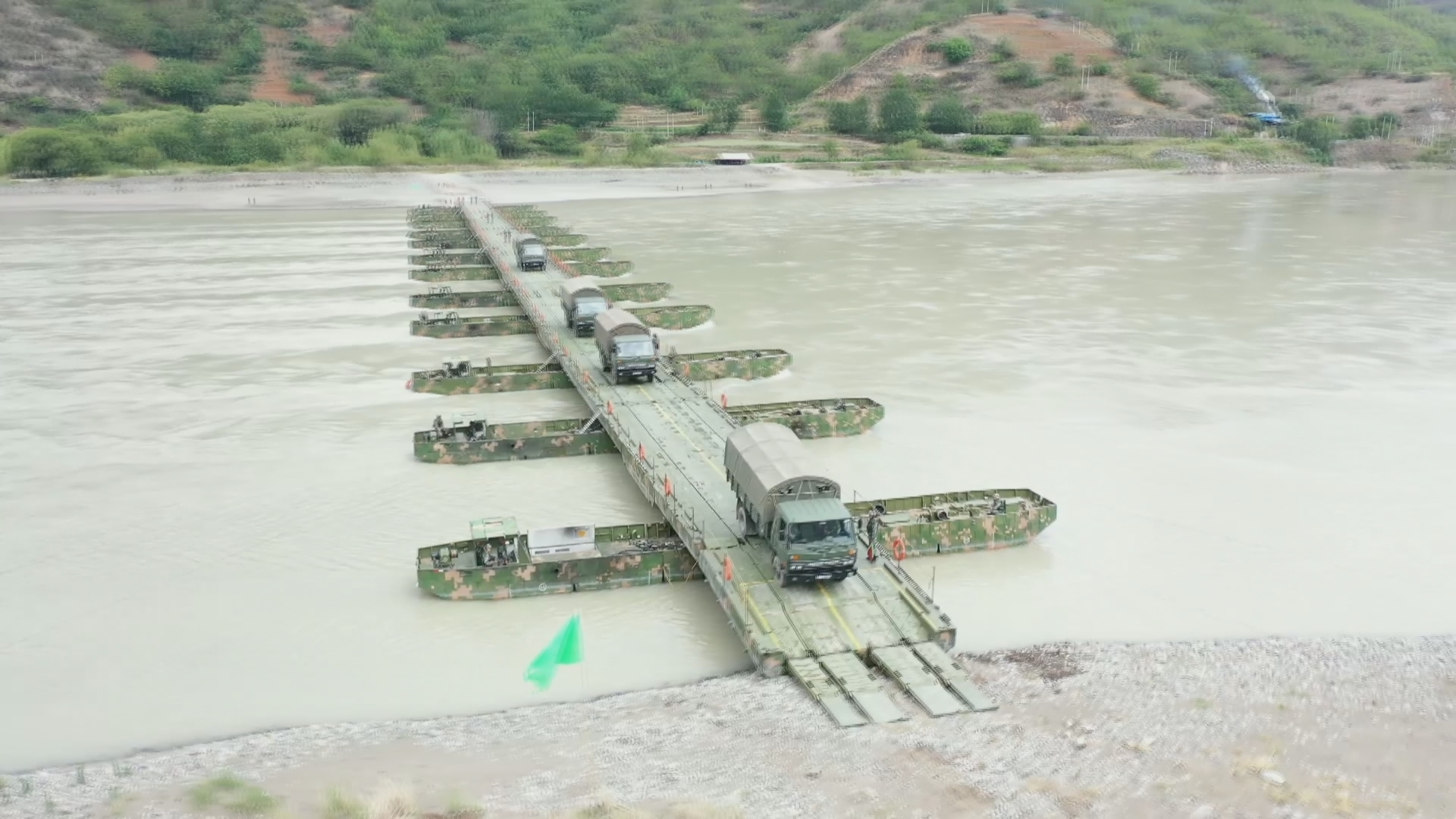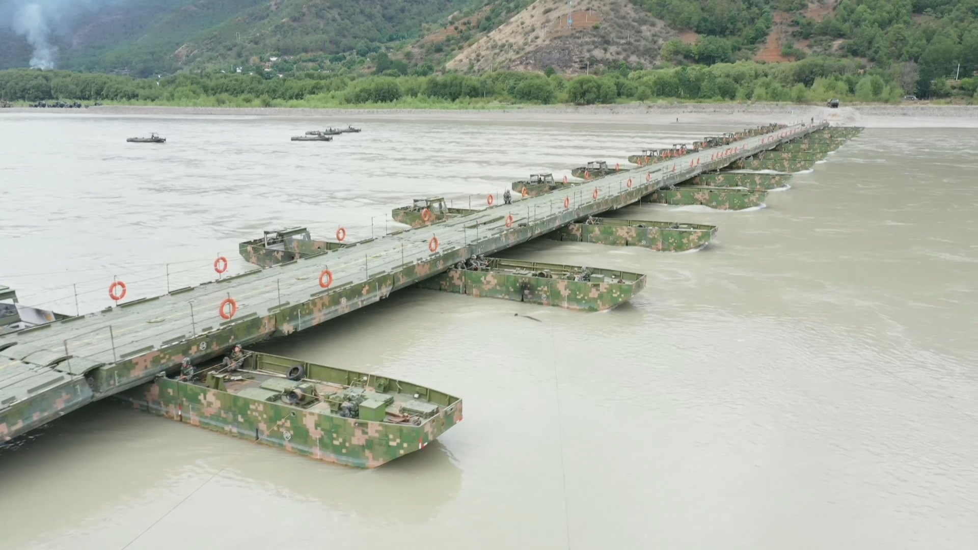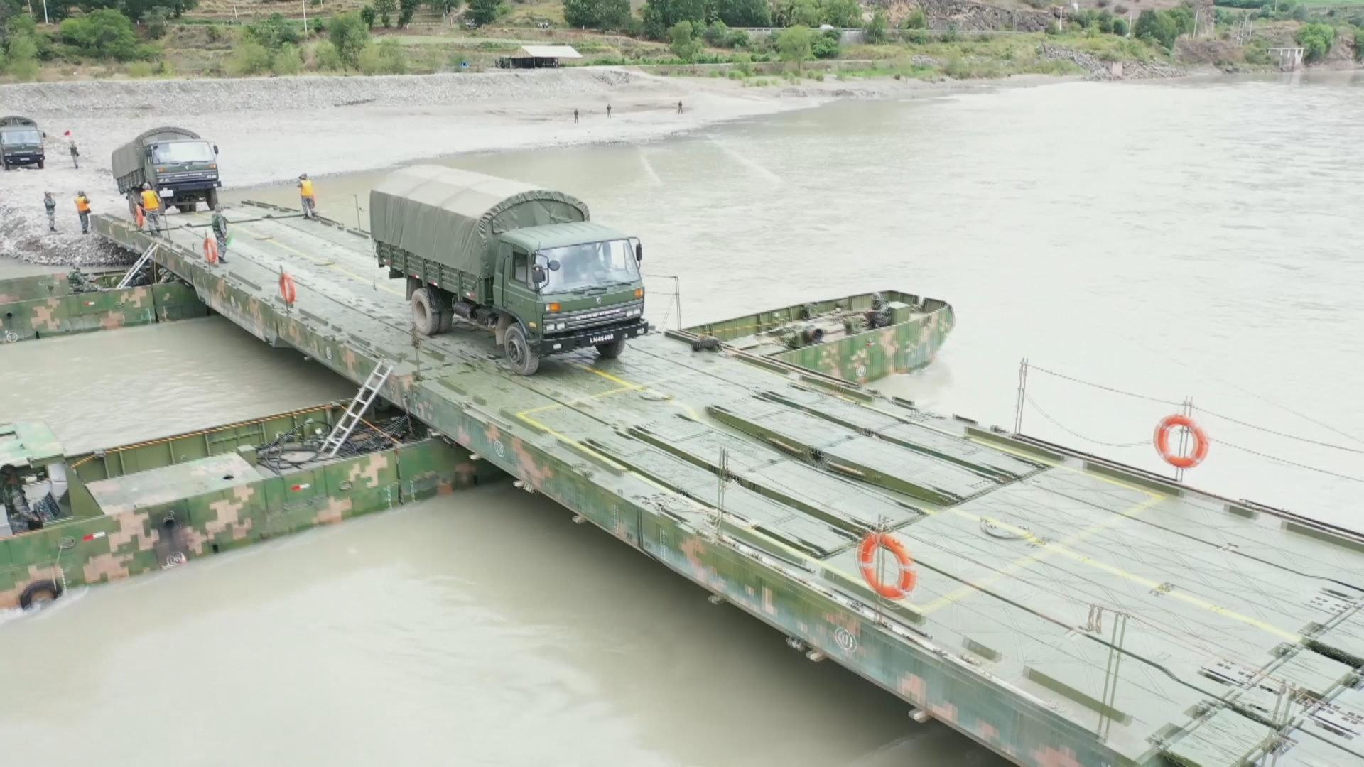 仅用时25分钟,一座长222米的钢铁浮桥就横跨在了金沙江江面上,随后运输车队顺利通过浮桥。