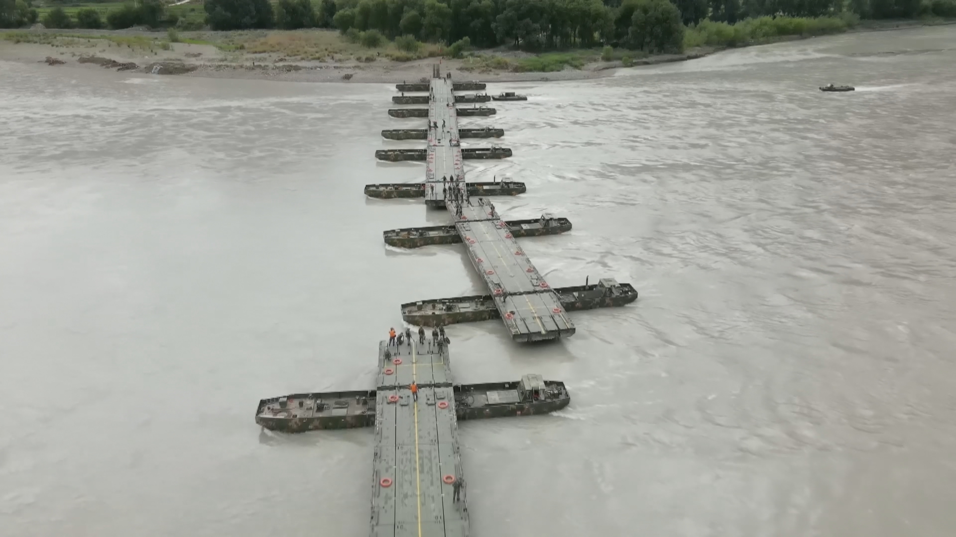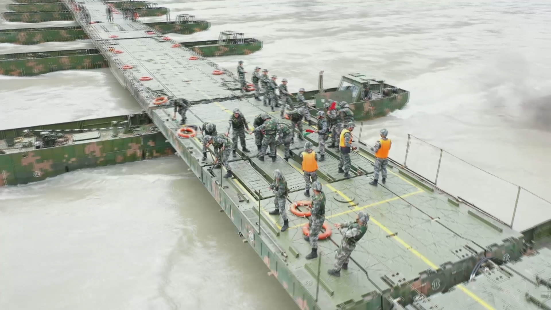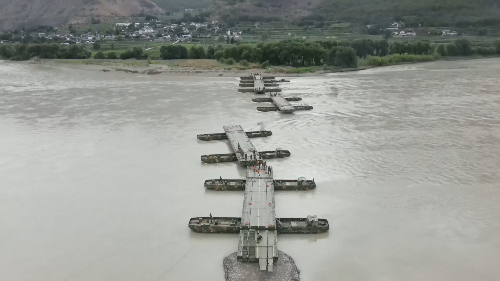 仅用时25分钟,一座长222米的钢铁浮桥就横跨在了金沙江江面上,随后运输车队顺利通过浮桥。
