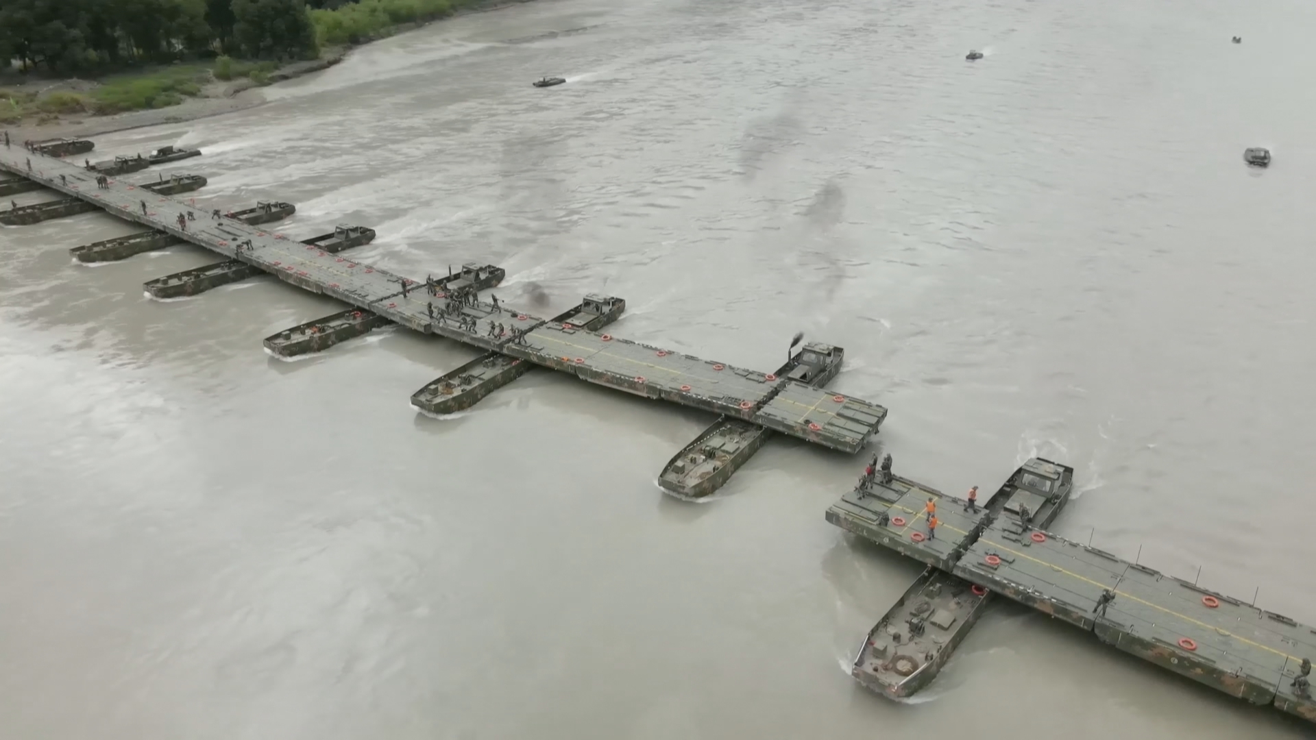 10:00,侦察分队迅速前出,实施水上侦察、水上障碍物排除;警戒防卫分队迅速占领渡场两岸并派出水上巡逻警戒;各门桥按照指挥员命令迅速从隐蔽区域开始向既定区域开进。