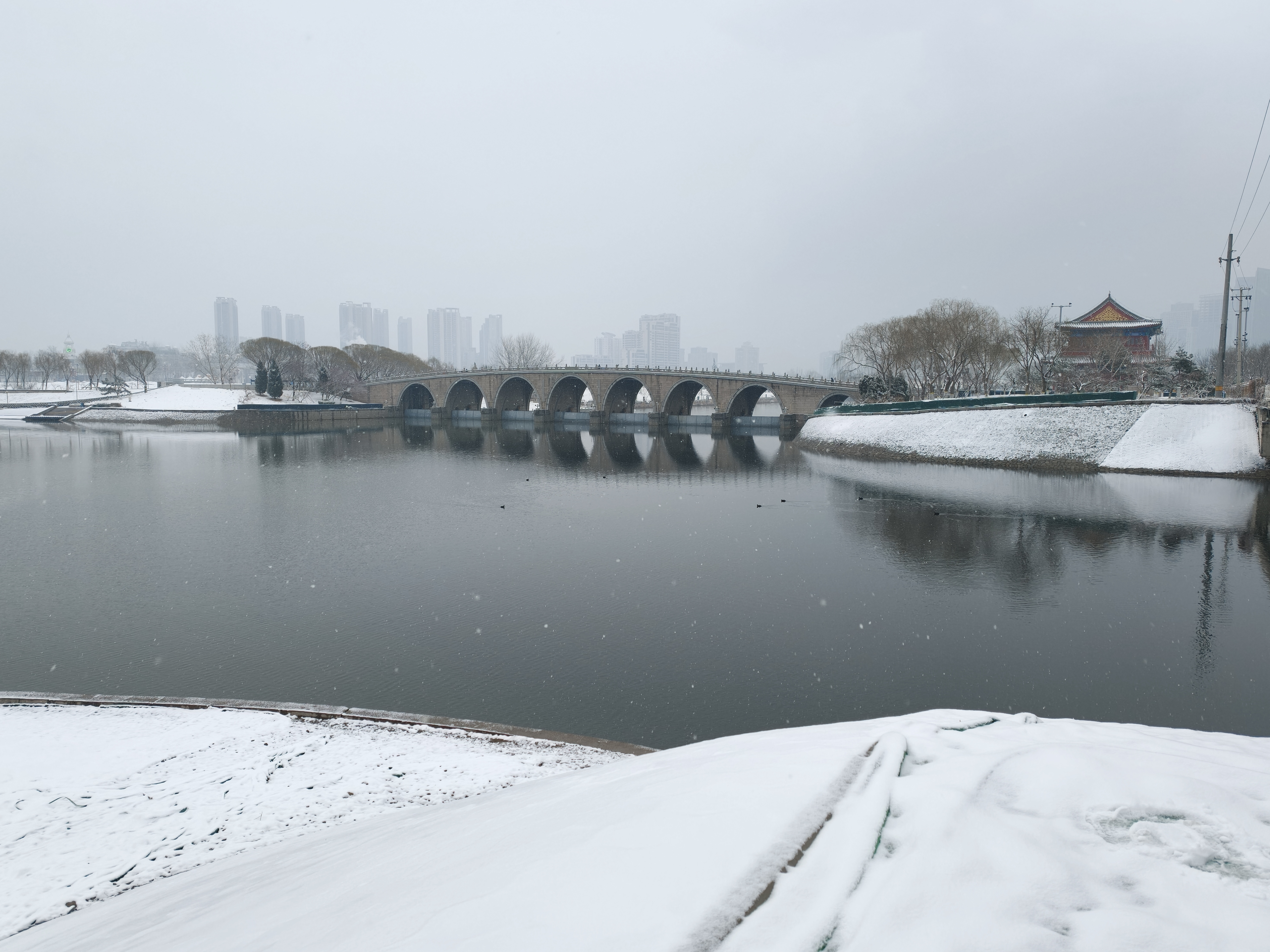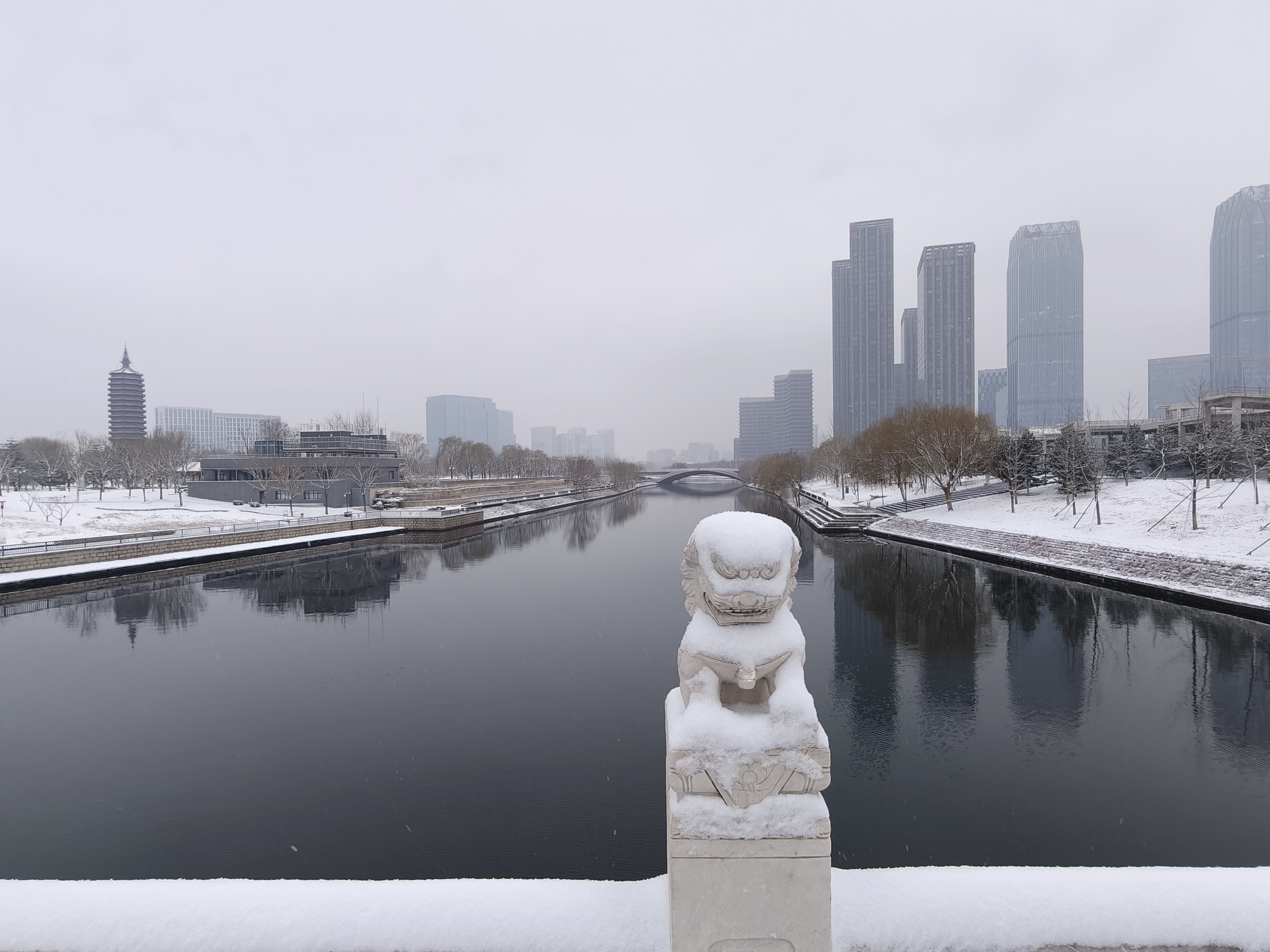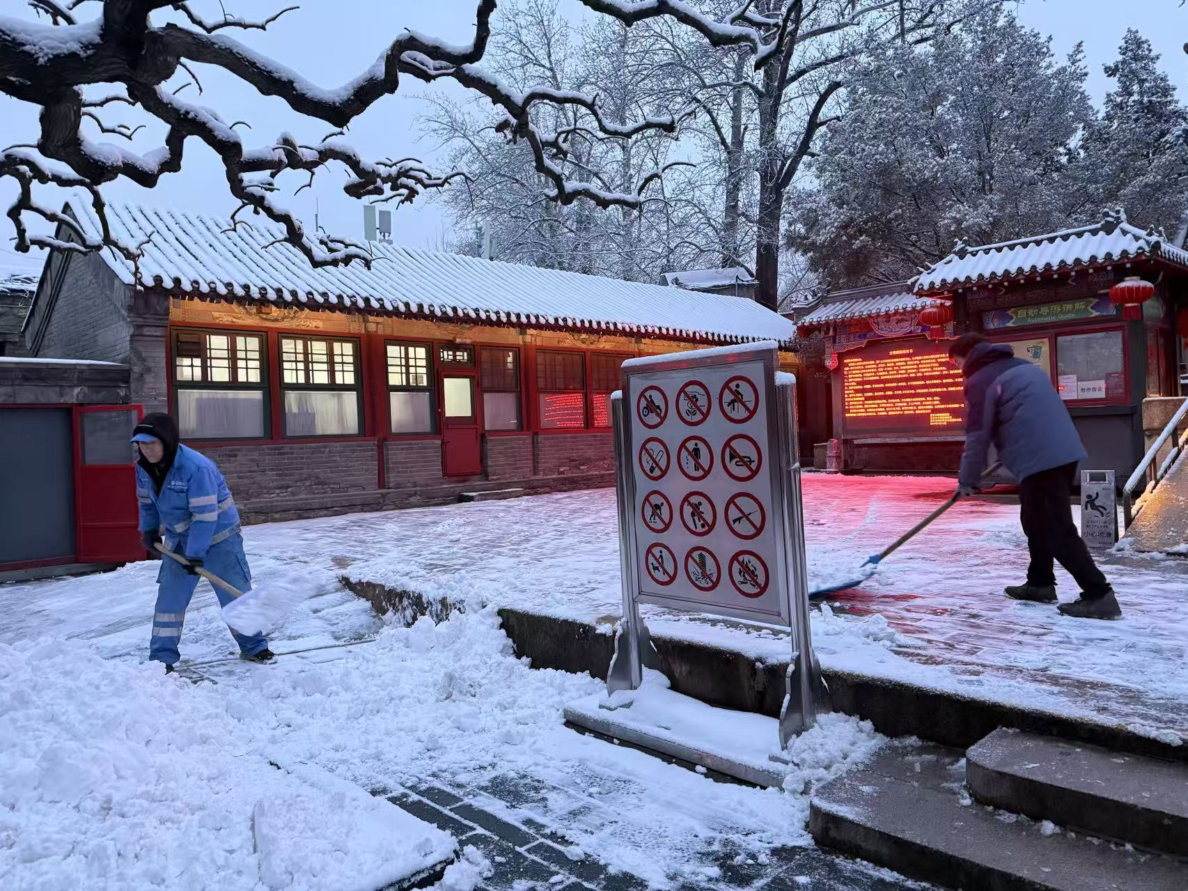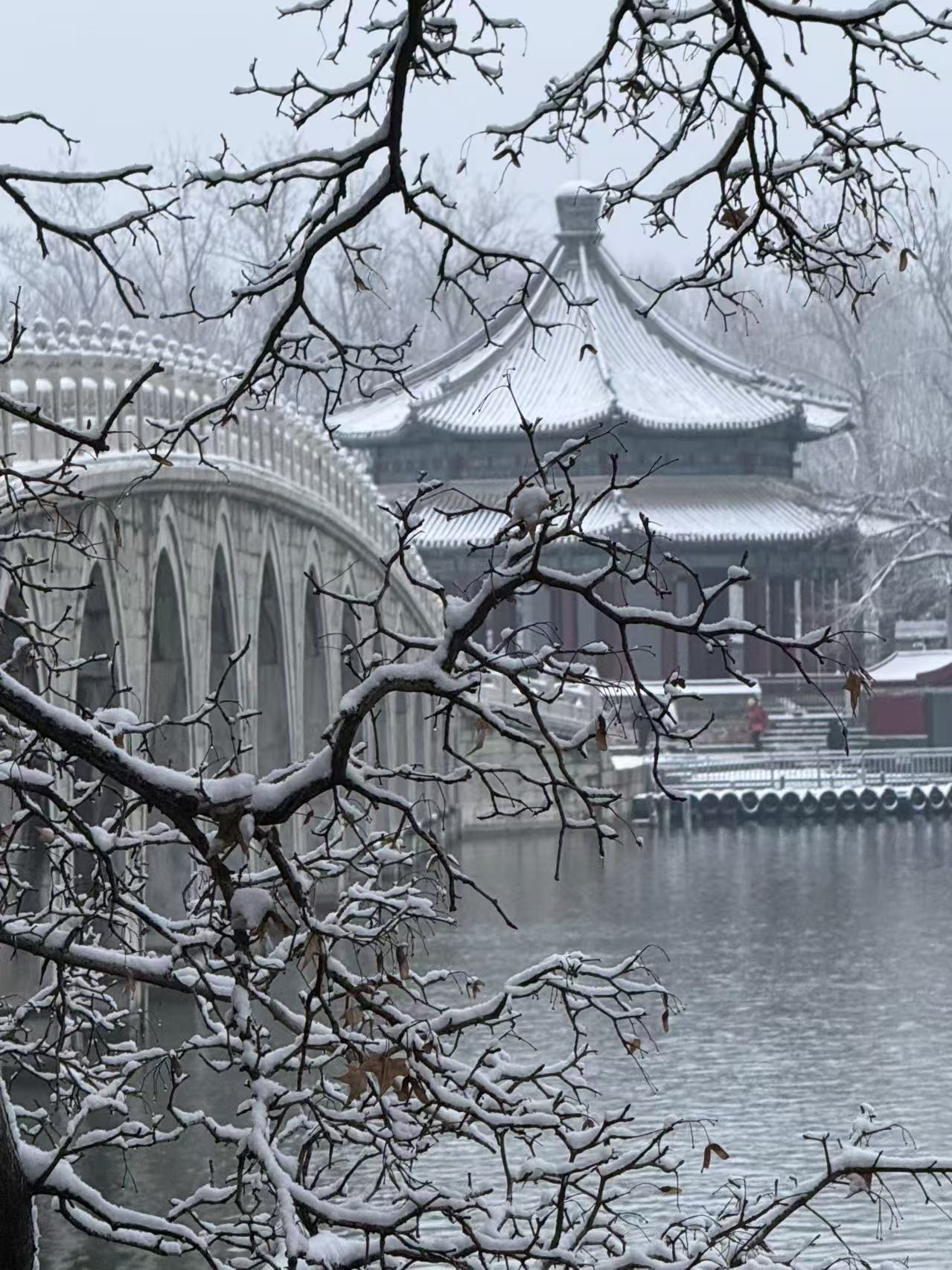 今天早晨,众多市民游客来到颐和园、景山公园、通州大运河畔等地赏雪景。