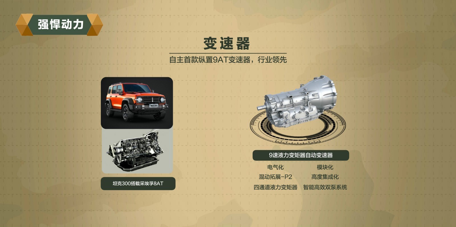 在动力方面,坦克平台涵盖ICE、PHEV、HEV三种动力形式,常规高效发动机实现了38%的同级最优发动机热效率。匹配中国首款纵置9AT变速器,扭矩密度和齿比跨度同级领先,实现了重量更轻、动力性能更好、效率更高。坦克平台的3.0GDIT+ 9AT P2的动力组合也堪称全球最强越野动力,其系统总功率为380kW,峰值扭矩可达750N·m,为坦克平台的极致越野提供了强劲的动力保障。
