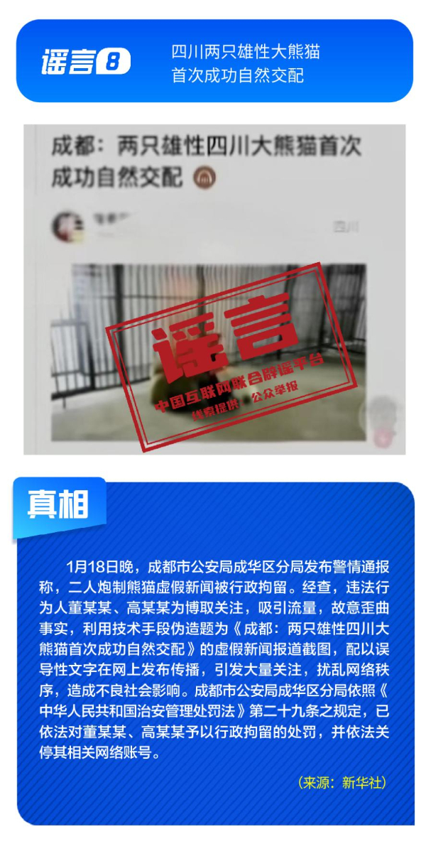 健康与科普领域谣言违背客观规律。“人血白蛋白是‘增加免疫力’的法宝”刻意夸大该处方药的临床用途,忽略其特定医疗场景与使用风险;所谓“大棚草莓、冷库葡萄、进口车厘子、染色砂糖橘是冬天水果界四大毒王”谣言片面解读农产品种植与保鲜方式,缺乏科学依据;“四川两只雄性大熊猫首次成功自然交配”纯属为吸引流量而捏造的猎奇内容,其视频画面为AI生成;“2026年8月12日地球将失去引力,导致6000万人死亡”更是无中生有的荒谬谣言。