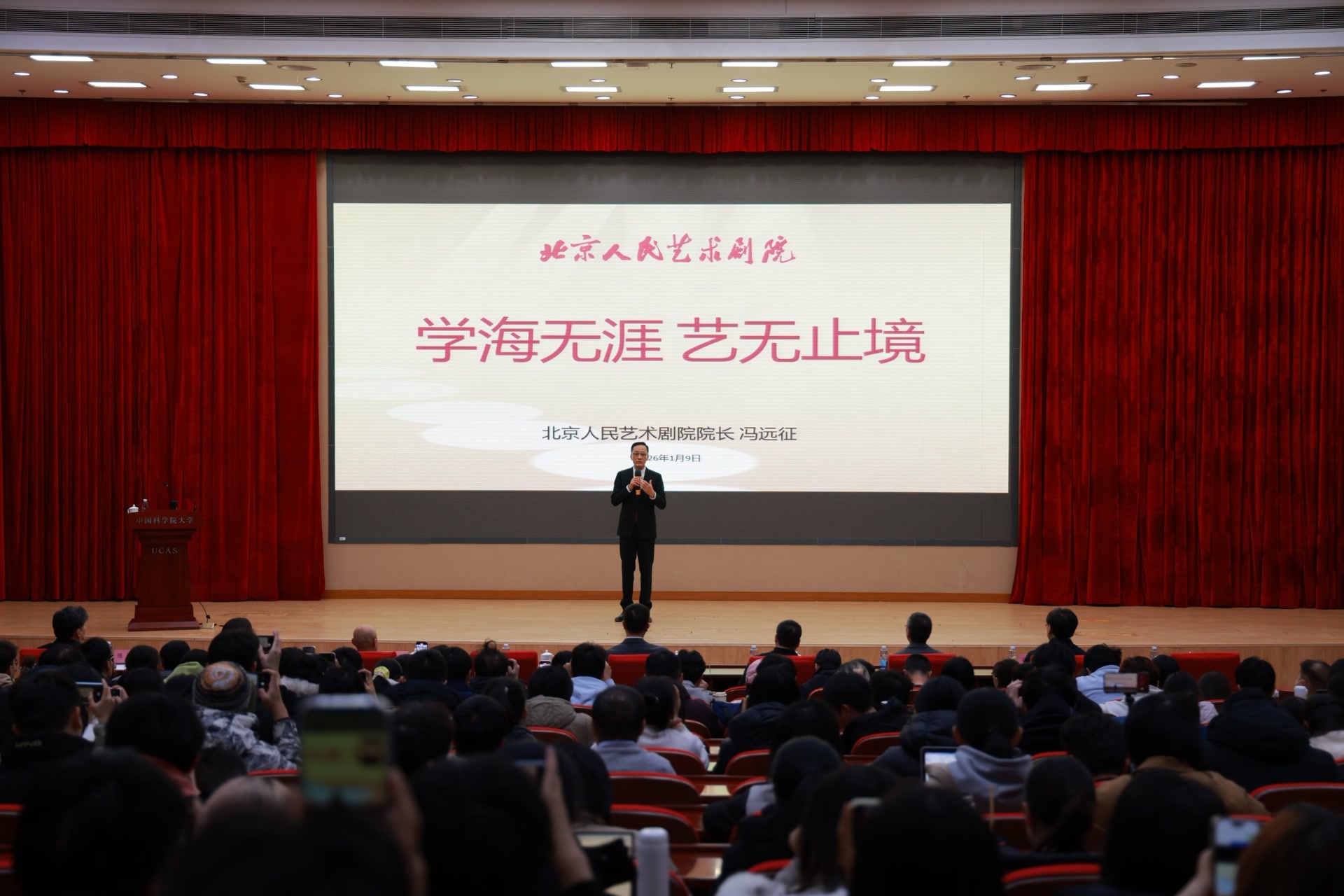1月9日,中国科学院大学(以下简称“国科大”)“人居:科学与艺术大讲堂”第三讲在怀柔区雁栖湖校区国际会议中心报告厅开讲。北京人民艺术剧院院长、国家一级演员冯远征以“学海无涯 艺无止境”为主题,与国科大师生共话“艺术人生”。