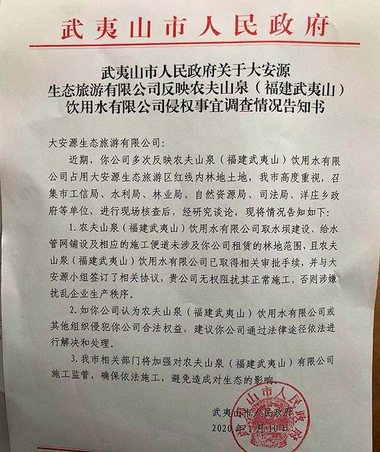 据农夫山泉向外界披露的文件显示,相关部门进行现场核查后,发现的情况是:农夫山泉武夷山公司取水坝建设、给水官网铺设及相应的施工便道未涉及你公司(大安源旅游生态有限公司)租赁的林地范围,且农夫山泉已经取得相关审批手续,并于大安源小组签订了相关协议。贵公司无权阻挠其正常施工,否则涉嫌扰乱企业生产秩序。”