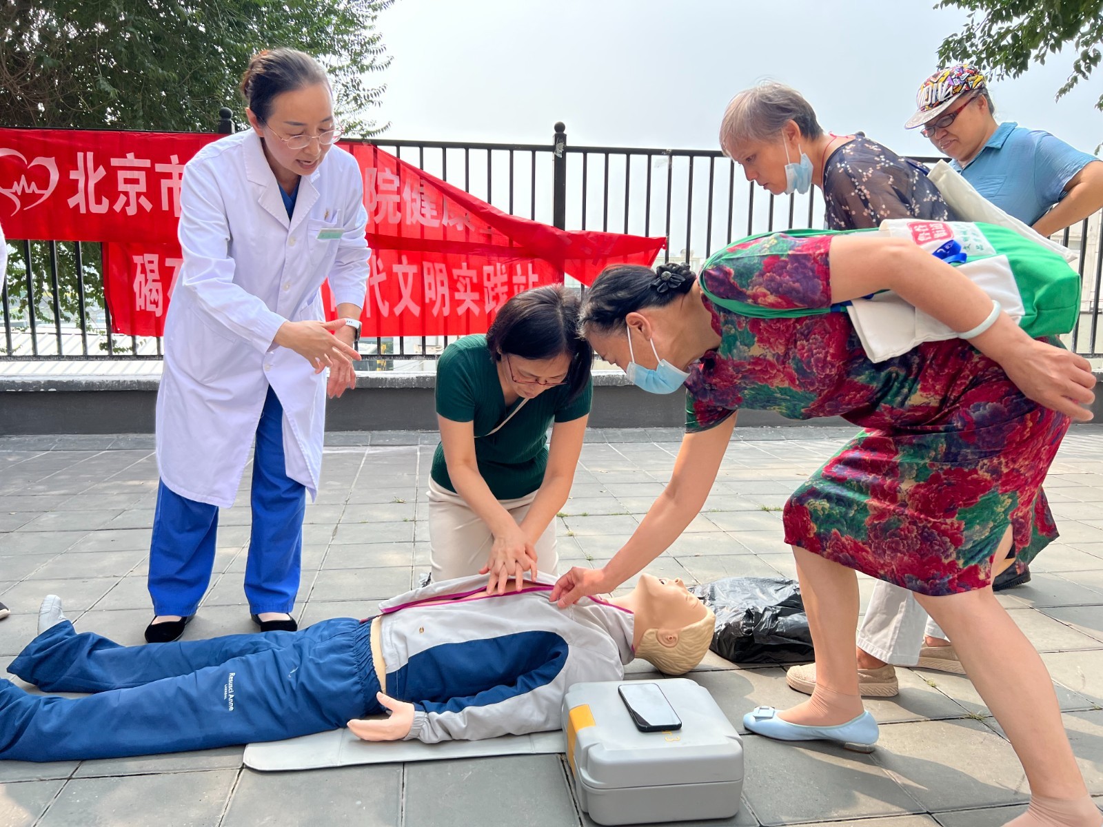 随后,来自石景山医院的医生拿出医学急救假人,真实地还原紧急情况发生的场景,在心肺复苏实操练习中,医生们为大家示范心肺复苏基本动作,讲解关键要领,再由各位居民依次进行心肺复苏实操练习,让更多居民了解心肺复苏的技巧,提升居民急救能力。