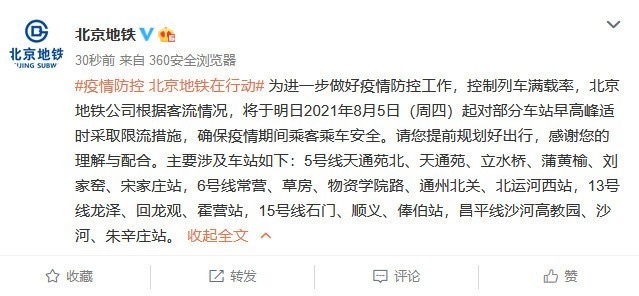 为进一步做好疫情防控工作,控制列车满载率,北京地铁公司根据客流情况,将于明日2021年8月5日(周四)起对部分车站早高峰适时采取限流措施,确保疫情期间乘客乘车安全。请您提前规划好出行,感谢您的理解与配合。