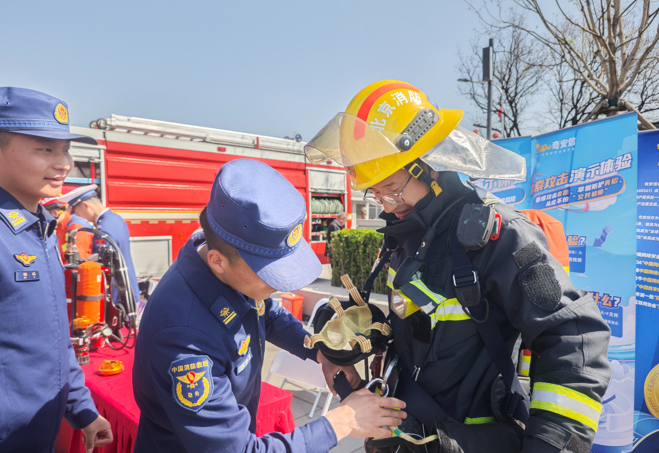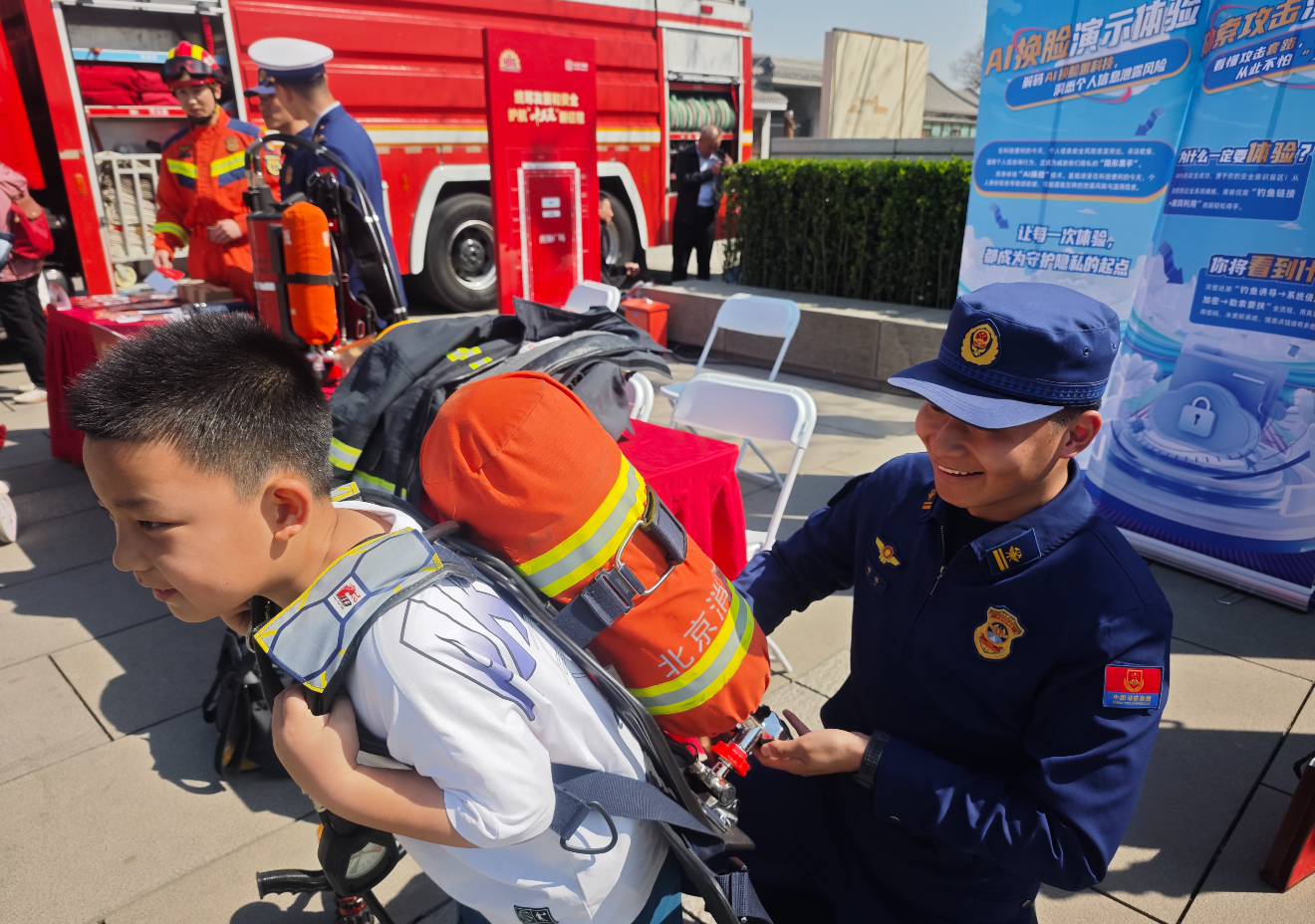 4月11日上午,在丰台区宛平城的醒狮广场,孩子们在消防员的帮助下试穿消防战斗服、学习如何正确佩戴逃生面罩、如何系逃生绳结。支队积极响应区政府号召,在第十一个全民国家安全教育日前夕,参与到“统筹发展和安全 护航‘十五五’新征程”主题宣传教育活动当中。通过向居民发放家庭消防安全宣传资料,开展消防知识答题赢刮刮卡活动,向辖区居民们科普日常用火用电等消防安全基础知识的同时,有效调动居民参与热情,进一步提高了广大居民群众的消防意识,达到“一人学习、带动全家、教育大众”的目的。