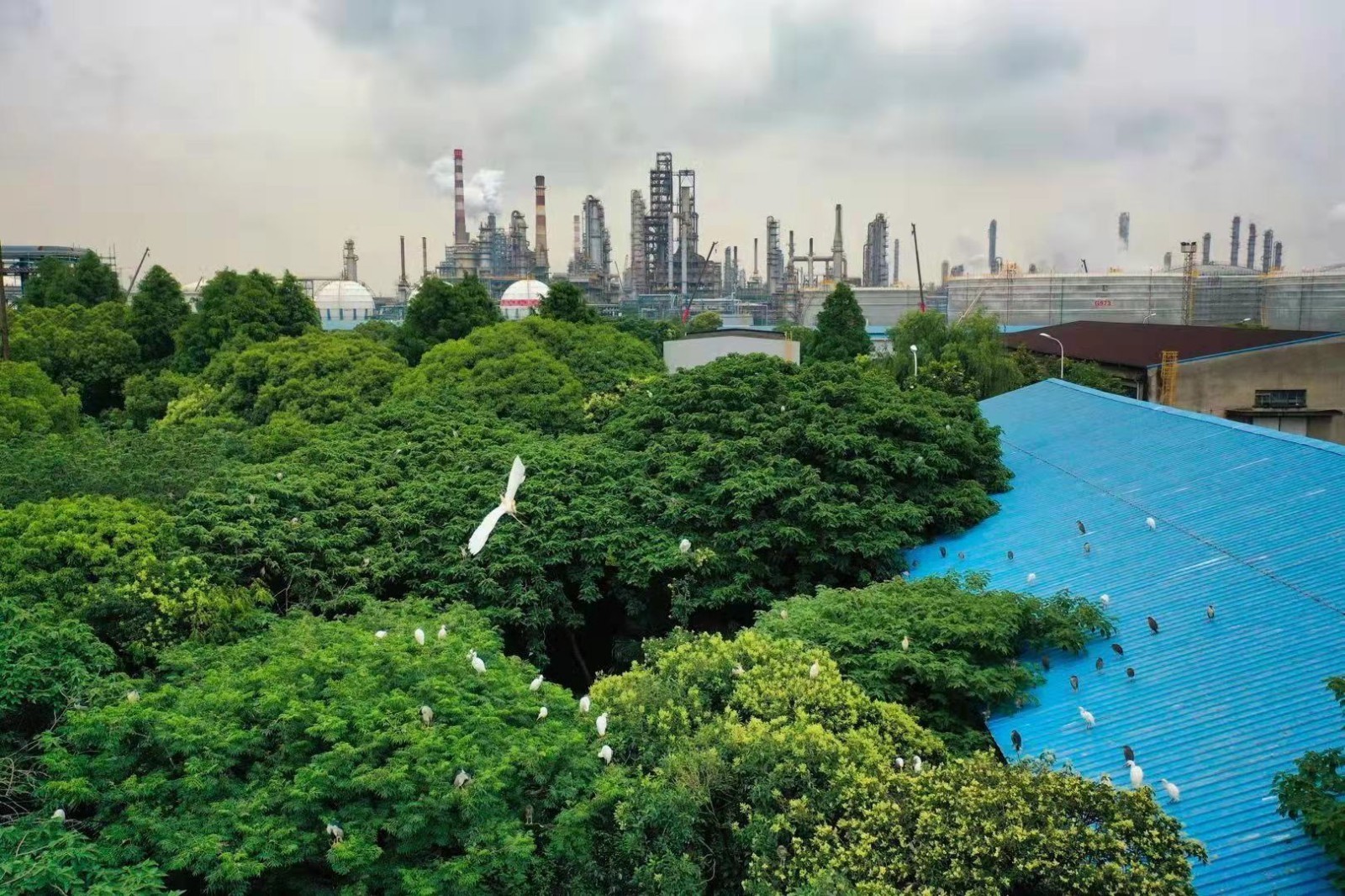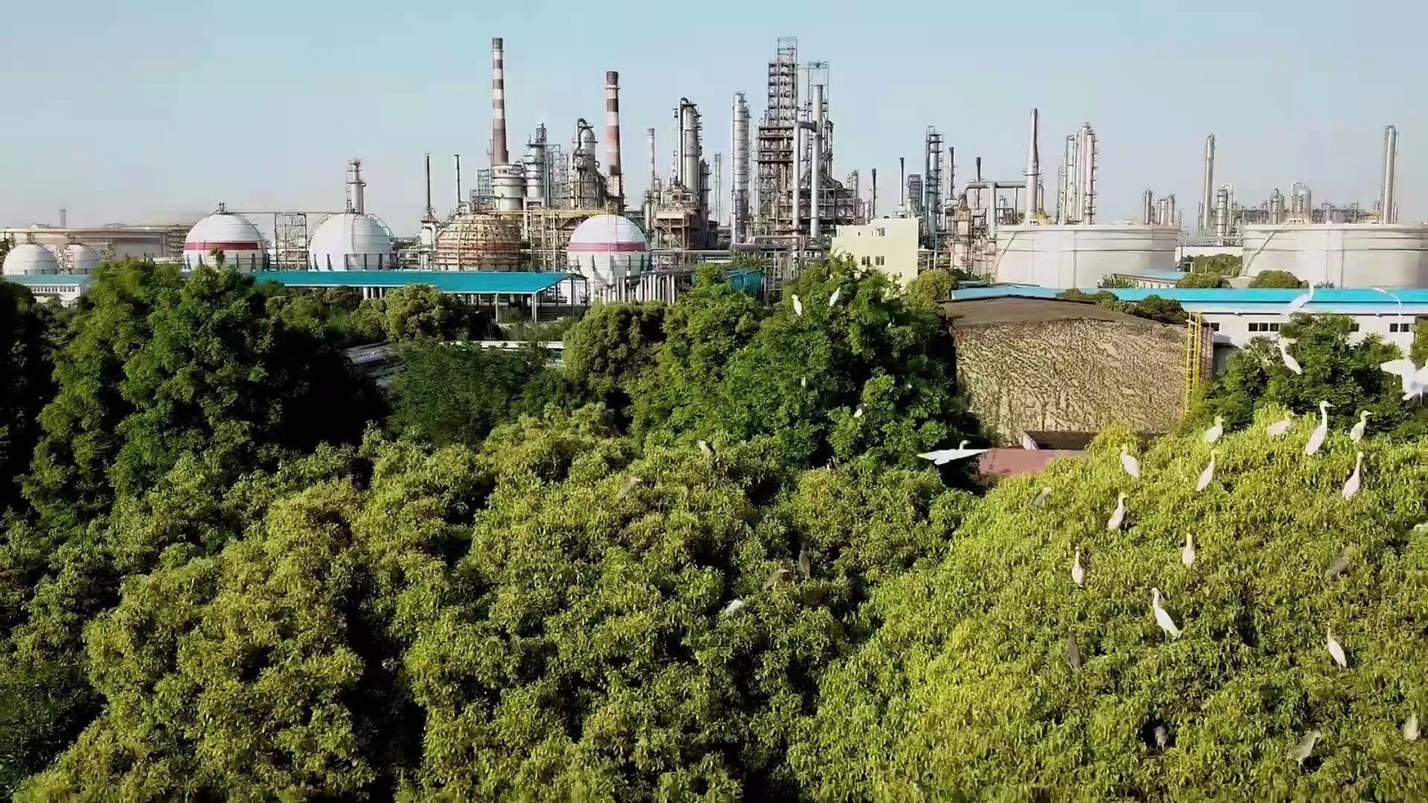 中国石化所属镇海炼化公司厂区内,千余只鹭鸟聚集在炼塔之间的小树林栖息繁衍,与工人和谐共处,和炼塔油罐相映成趣,在净化污水排放口,水草茵茵,白鹭在汀,从容觅食,构成一幅现代工业文明与生态文明和谐相处的唯美景象。