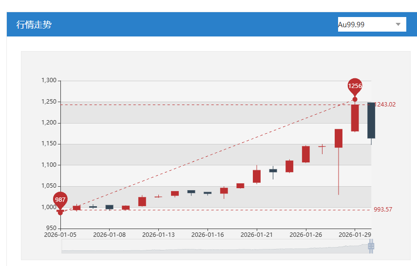 上海黄金交易所延时行情显示,1月30日,Au99.99的最低价报1148.01元/克,最高价报1248.5元/克,均低于1月29日,截至发稿最新价报1164元/克。