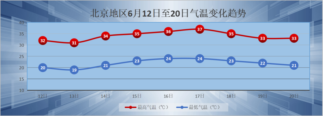 预计南郊观象台从6月12日至20日,最高气温31~37℃,最低气温19~24℃。