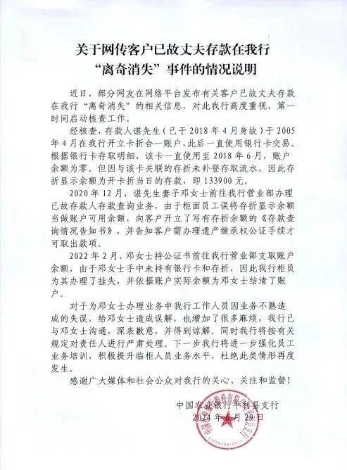 女子称“亡夫13万元存款消失、账户被注销”,银行回应——