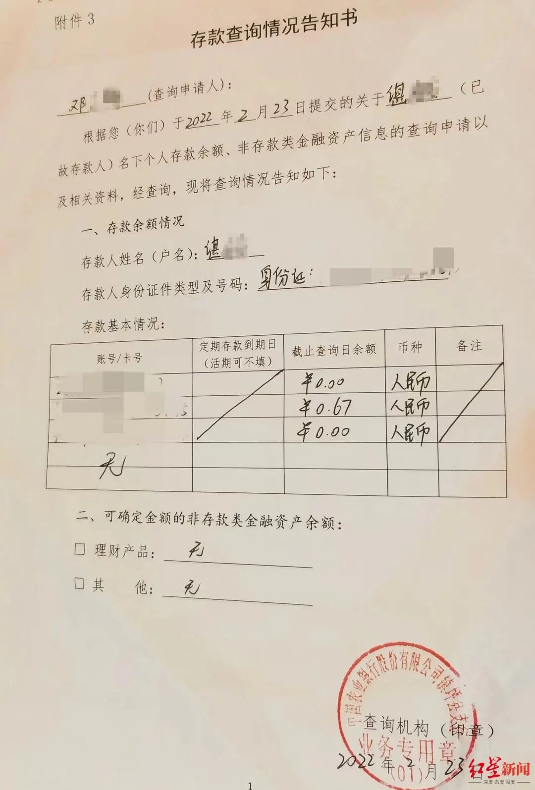 2021年12月17日涉事银行出具的存款查询信息