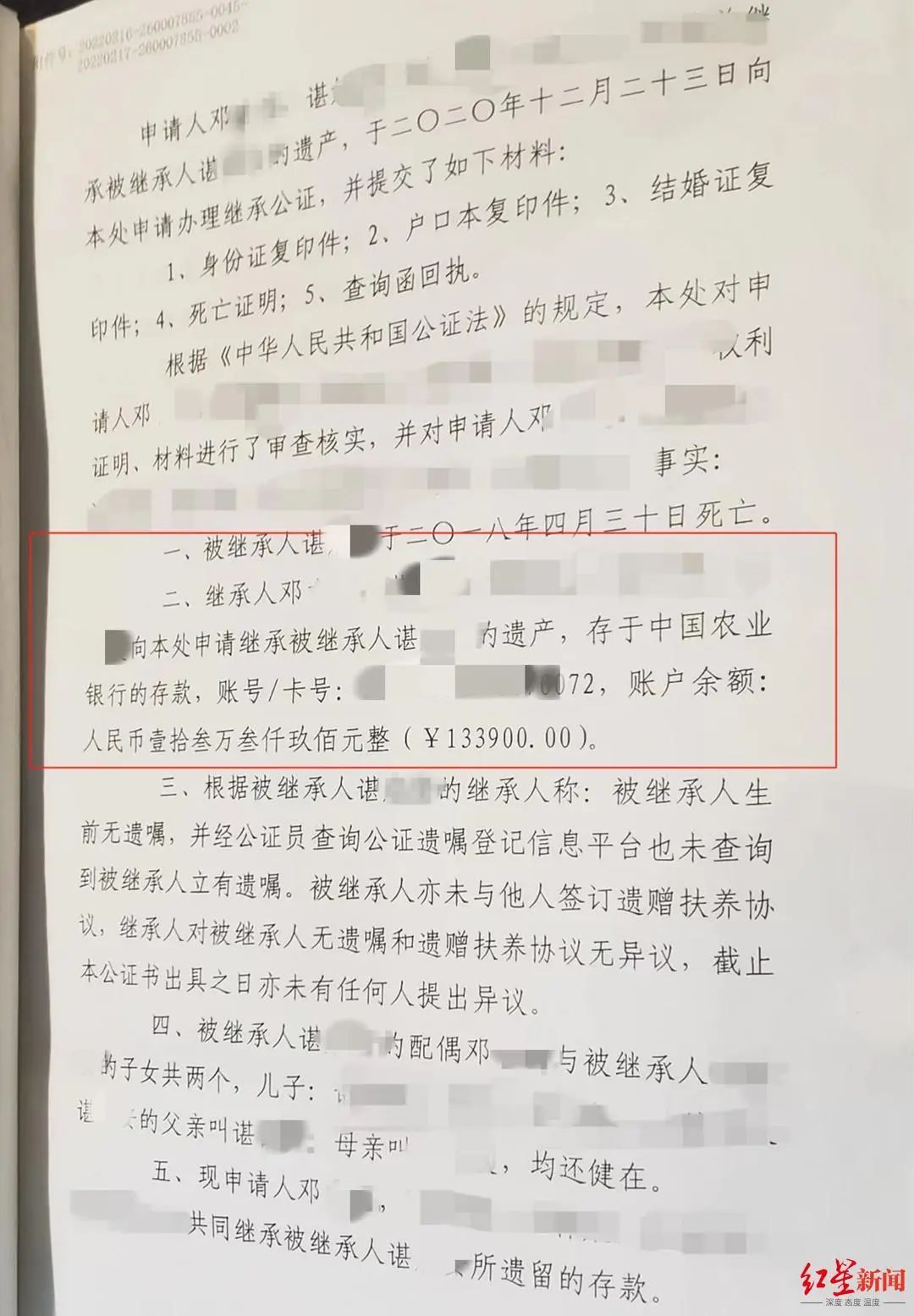 据银行的要求,邓女士想要取出丈夫的存款遗产,如果死亡人还有相关直系亲属,需要所有继承人在公证处进行公证,邓女士只得按照银行的要求照做。随后,邓女士本人和夫妇俩的两个儿子以及邓女士丈夫的父母,共同向平利县公证处申请了继承遗产公证。