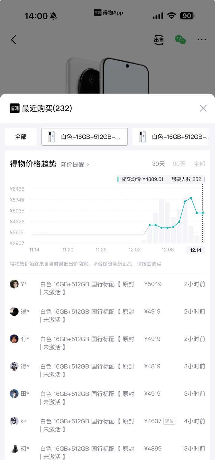 据得物App监测,该机型官方定价3499元。发售初期,二级市场成交价约为4089元。随后,受科技圈人士关注及市场对“系统级AI”功能的猎奇心理影响,价格一路走高。12月11日,成交价达到历史峰值6529元,溢价超过3000元。在第三方闲置交易平台上,初期甚至出现了“F码”被炒至千元的情况,更有个别卖家喊出了3.6万元的整机报价。