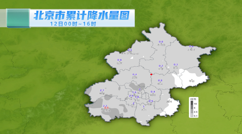 截至12日16时,全市平均降水量为1毫米,但分布不均。房山等部分地区降水量超过5毫米,已达到大雪级别。