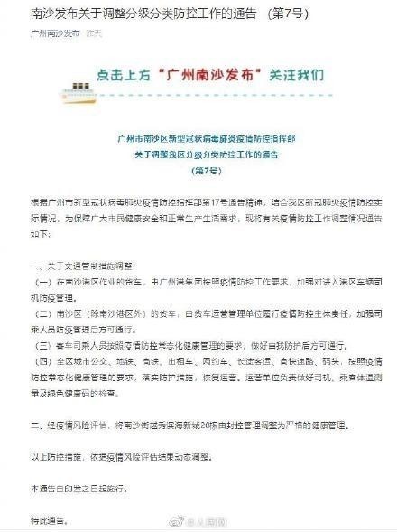 6月6日深夜,广州市南沙区新冠肺炎疫情防控指挥部发布通告,根据广州市新冠肺炎疫情防控指挥部第17号通告精神,结合南沙区新冠肺炎疫情防控实际情况,为保障广大市民健康安全和正常生产生活需求,现将有关疫情防控工作调整情况通告如下: