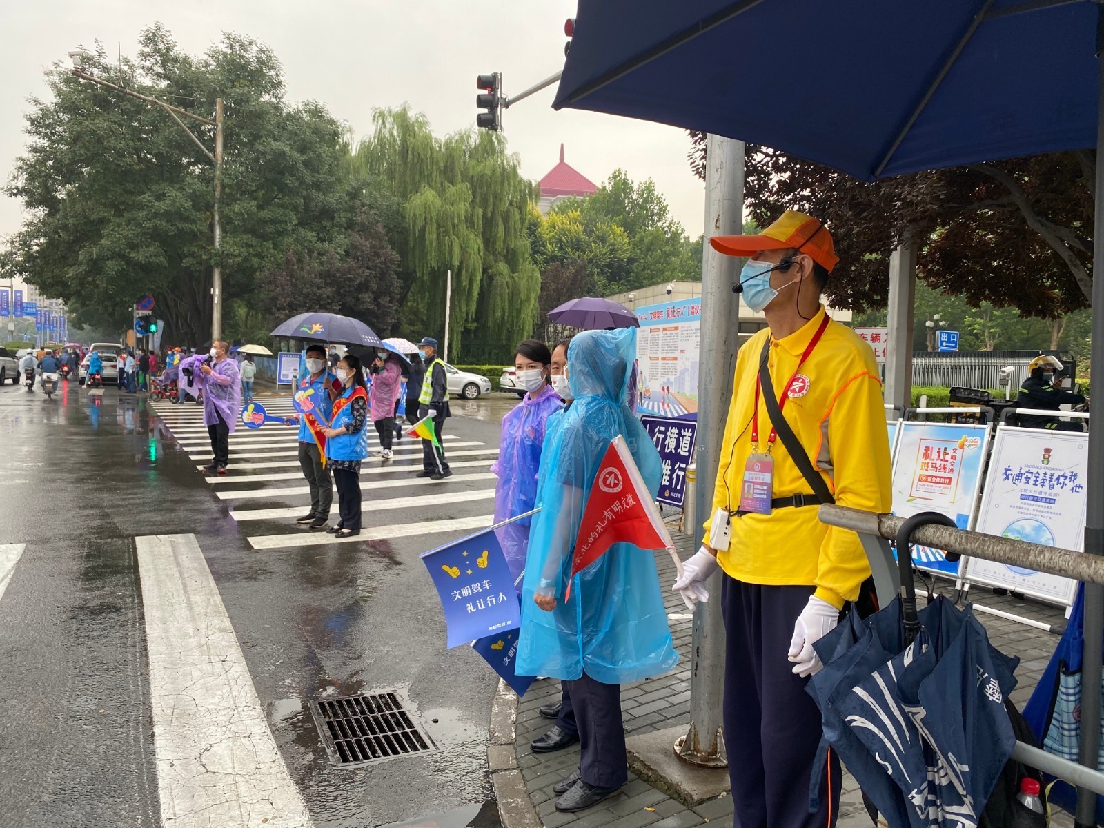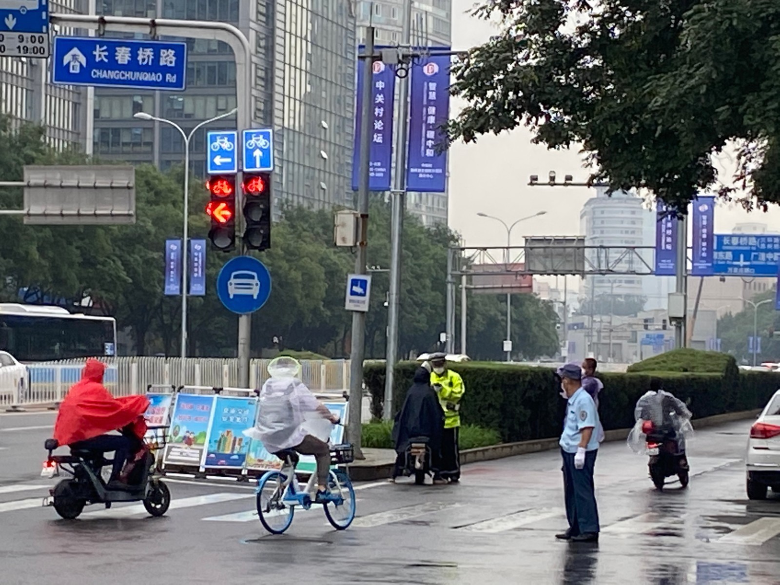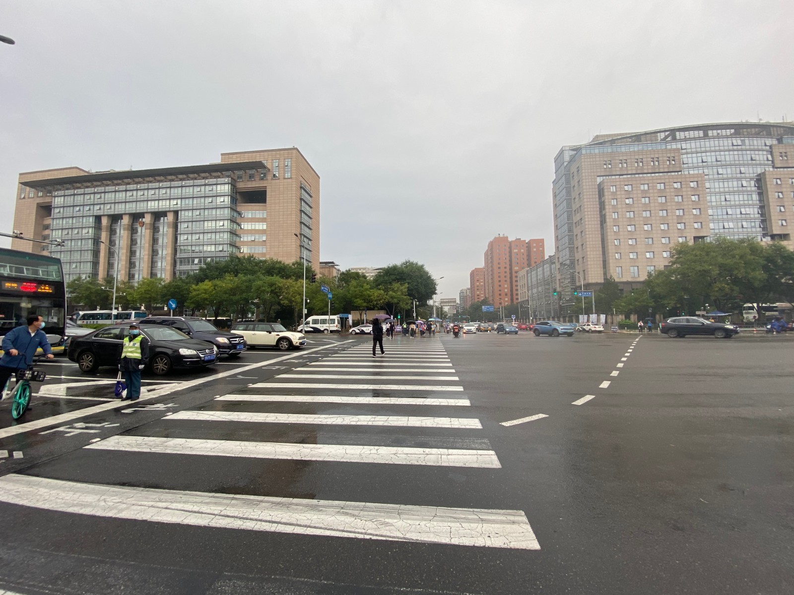 今天早晨天降小雨,7:00北京广播电视台《北京新闻》主播聂一菁一行人来到长春桥路口,她要在这个路口参与“礼让斑马线”的文明引导工作,切身体验雨天的早高峰路面交通的礼让情况如何。