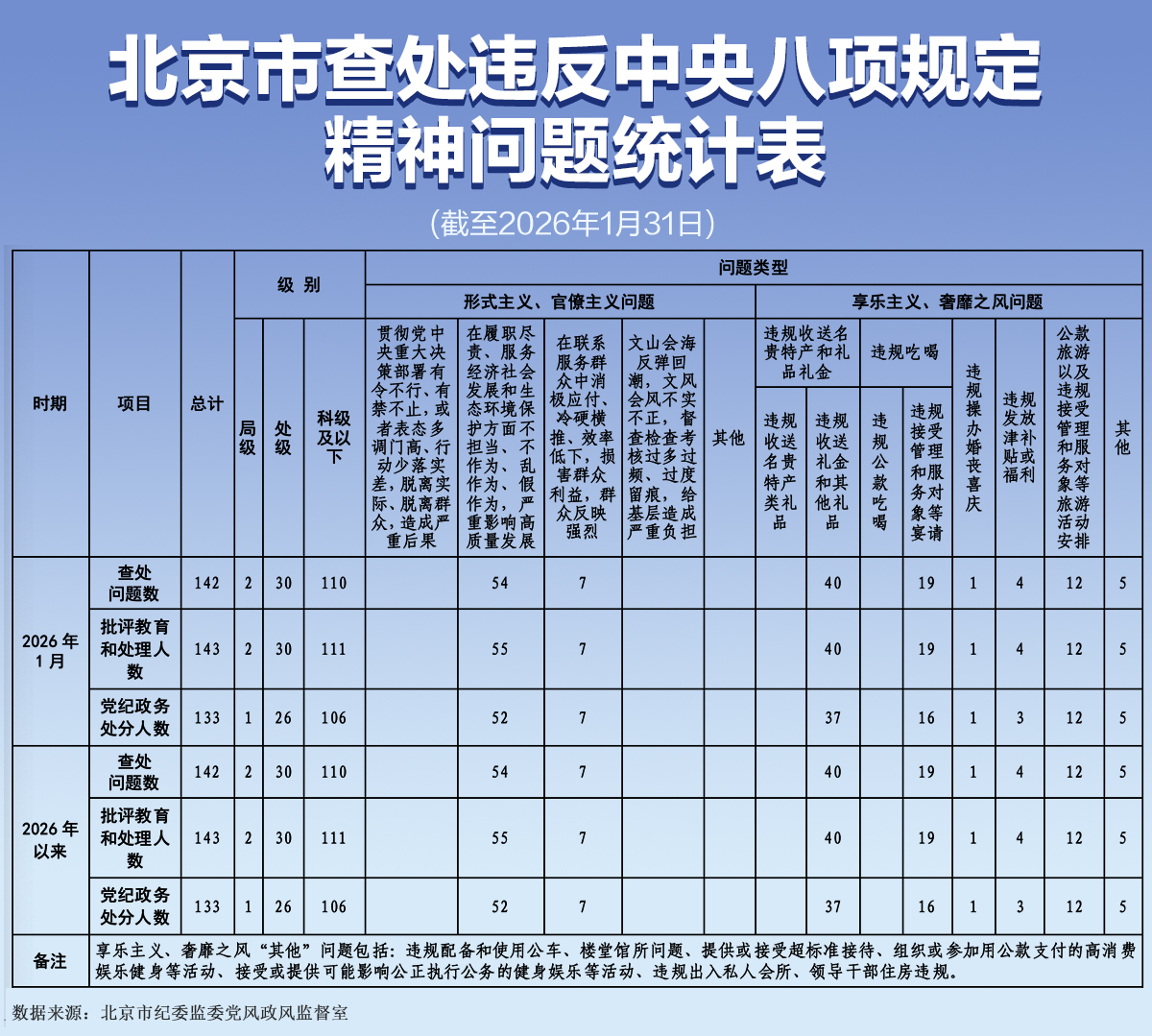 日前,市纪委监委公布了今年1月查处违反中央八项规定精神问题汇总情况。当月,全市共查处违反中央八项规定精神问题142起,批评教育和处理143人,其中党纪政务处分133人。