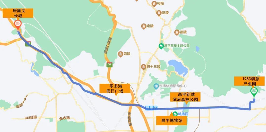 骑行路线起点为1983创意产业园,终点为居庸关长城,途经昌平新城滨河森林公园、昌平博物馆、乐多港假日广场等地点,全程约30公里,预计用时2小时。
