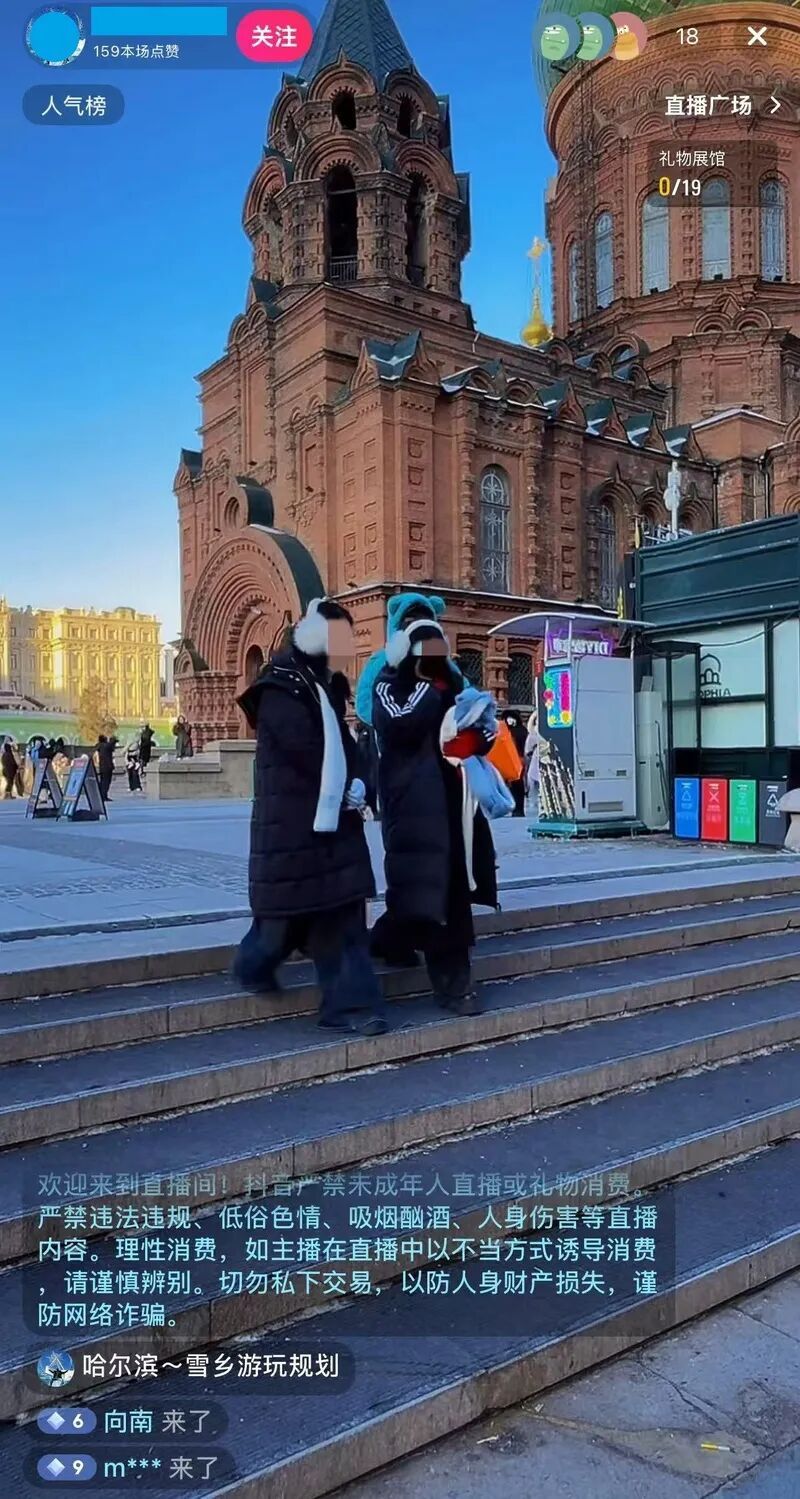 哈尔滨索菲亚教堂前直播路人进入画面/打码为记者处理