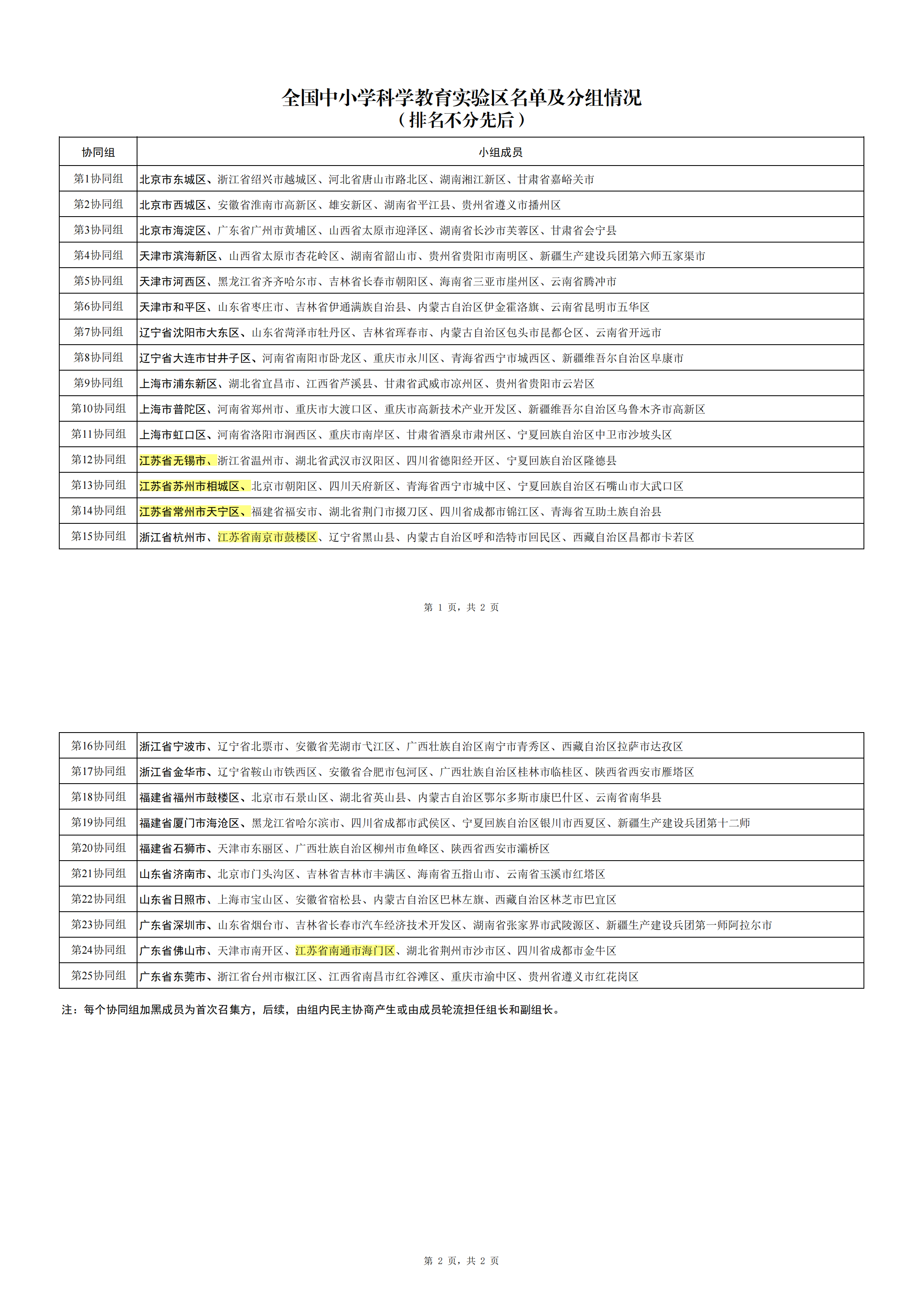 其中,江苏有多个区和多所学校入选。江苏省无锡市、江苏省苏州市相城区、江苏省常州市天宁区、江苏省南京市鼓楼区、江苏省南通市海门区入选首批全国中小学科学教育实验区,江苏省新海高级中学、南京师范大学附属中学、南京市第一中学、常州市武进区星河实验学校、苏州第十中学校、江苏省海安高级中学、江苏省清河中学、宝应县开发区国际学校、江苏省前黄高级中学、连云港海头中心小学、苏州市吴江区杨嘉犀实验学校、南京外国语学校河西初级中学、苏州市金阊外国语学校、常熟市王淦昌高级中学、常州市武进区前黄实验学校、江苏省泰兴中学、江苏省镇江中学、南通大学附属中学、宿迁经济技术开发区黄河小学、宿迁经济技术开发区厦门路实验学校、徐州市第一中学、淮安市周恩来红军小学、江苏省建湖高级中学、南京市光华东街小学、南京市金陵小学、徐州市大马路小学校、丹阳市华南实验小学、江苏省江都中学、徐州市科技中学、盐城市大丰区实验初级中学、扬州市翠岗中学、淮阴师范学院附属小学、南通师范学校第一附属小学、泰州市凤凰小学、盐城市串场河小学、海安市海陵中学、江苏省宿迁市马陵中学、江苏省泰州中学附属初级中学入选首批全国中小学科学教育实验校。