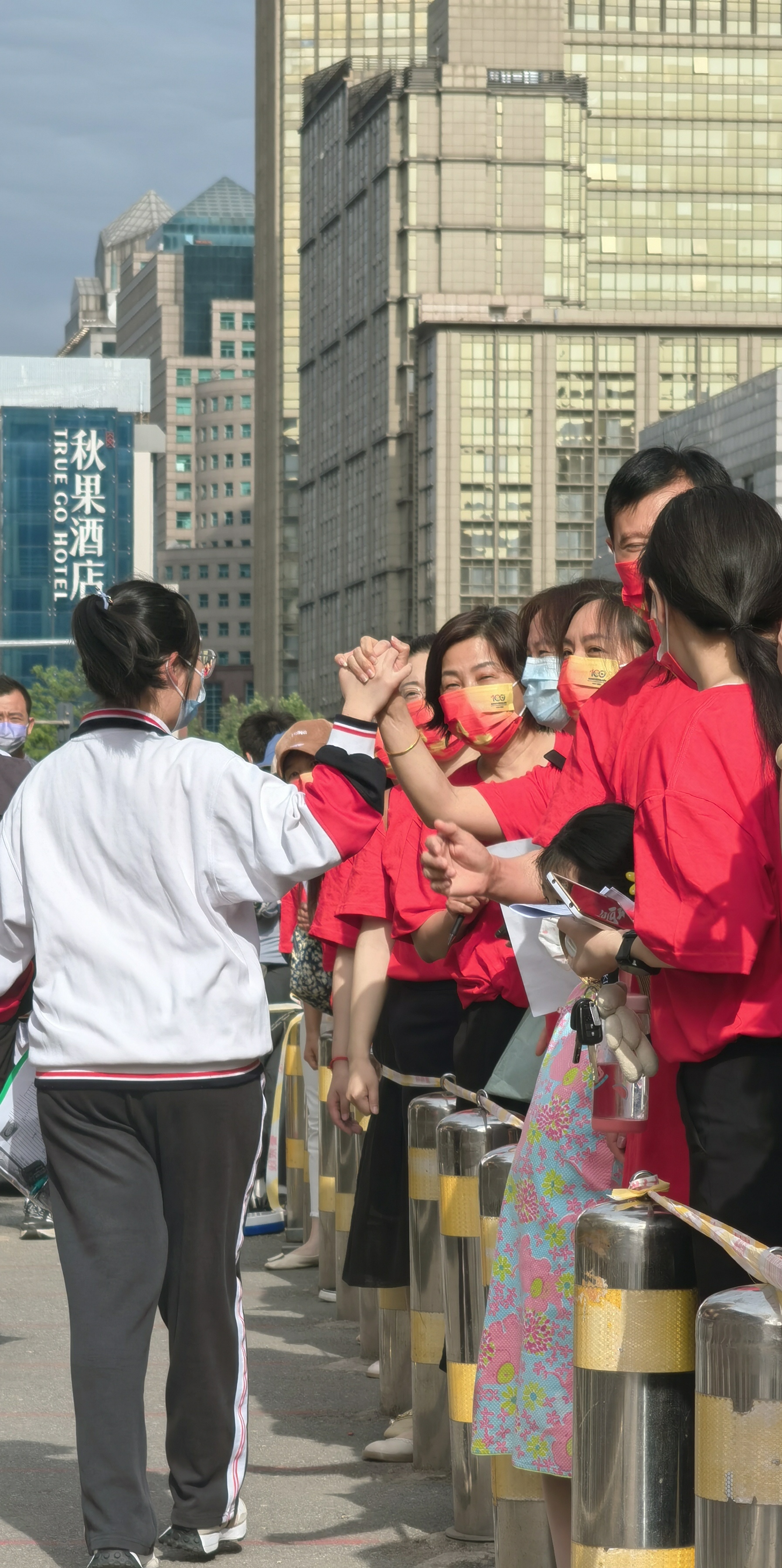 早上8点左右,考生在工作人员的指引提示下,出示准考证、身份证后,有序排队进入考点。考生进场通道旁,陈经纶中学的部分教师身穿印有“高考必胜”字样的红色T恤,整齐排列,或竖起大拇指为过往的考生点赞、送上祝福,或伸出手与考生击掌,为大家加油助威。
