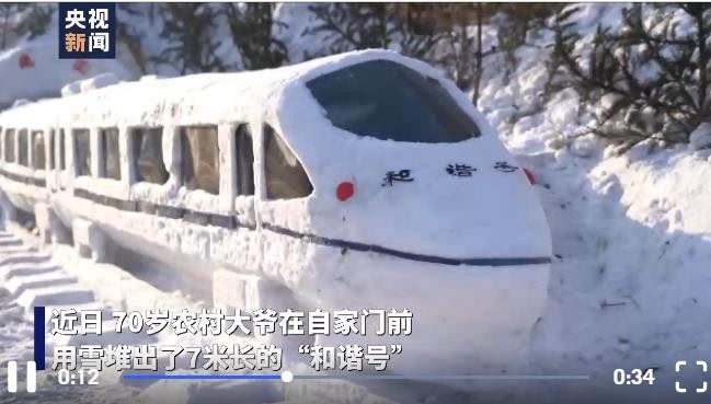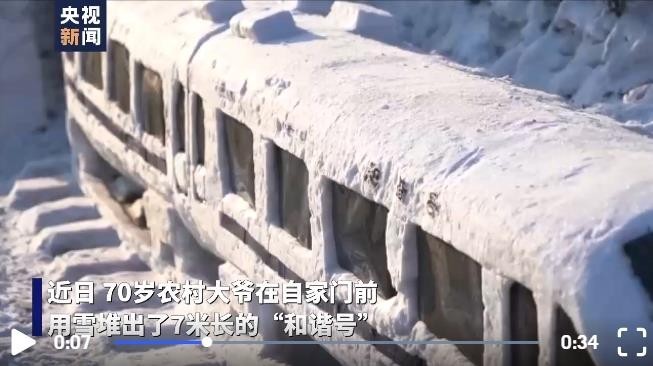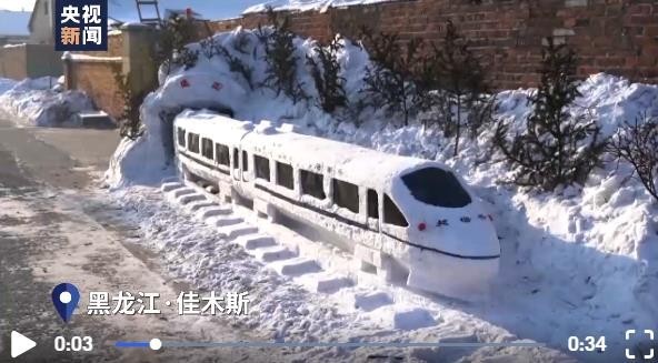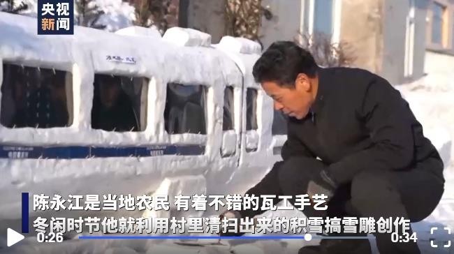 近日,家住佳木斯市东风区松江乡的陈永江,在自家门前用雪堆出了7米长的“和谐号”。陈永江是当地农民,有着一手不错瓦工手艺。冬闲时节,他就利用村里清扫出来的积雪搞雪雕创作。