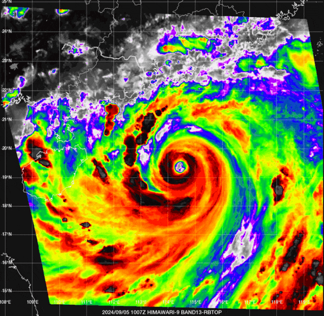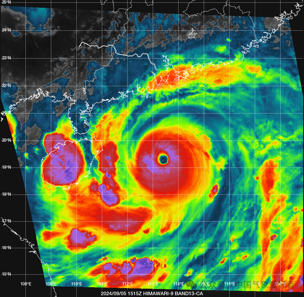 不过,9月5日傍晚起,随着副热带高压的增强,摩羯开始加速,从每小时8公里左右加快到了每小时17公里左右,离开了那块被它吸光能量的海域,来到了南海西部温暖的海域上。正因为此,摩羯的内眼墙再度获得了充分的能量供给,迅速加强复原,并与收缩的外眼墙融为一体,完成了一次非典型的眼壁置换。晚上7点后,摩羯的台风眼变得更加清晰,核心对流变得更加强盛,说明它已经开始新一轮增强。