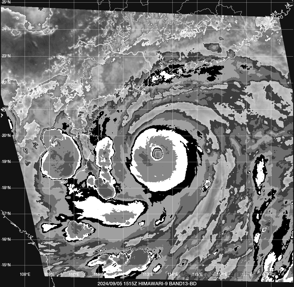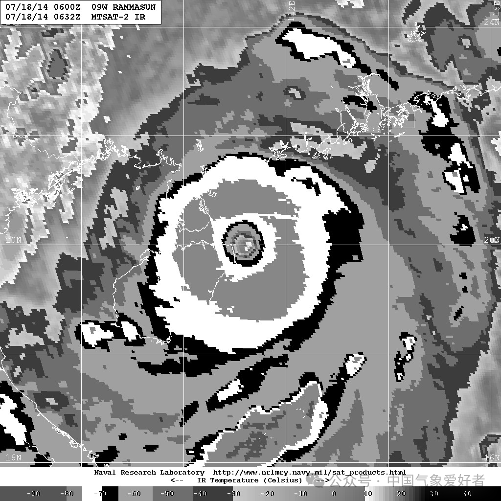 9月5日上午起,摩羯的台风眼墙开始破损减弱,外围雨带迅速合围包拢,形成外眼墙,试图取代内眼墙。这是强烈台风常有的结构调整,学名叫“眼壁置换”。一般在眼壁置换时,台风会毁容变丑,强度大幅下降,摩羯也不例外。9月5日中午12点,卫星云图上的摩羯变得皱皱巴巴,台风眼已经变得不规则。
