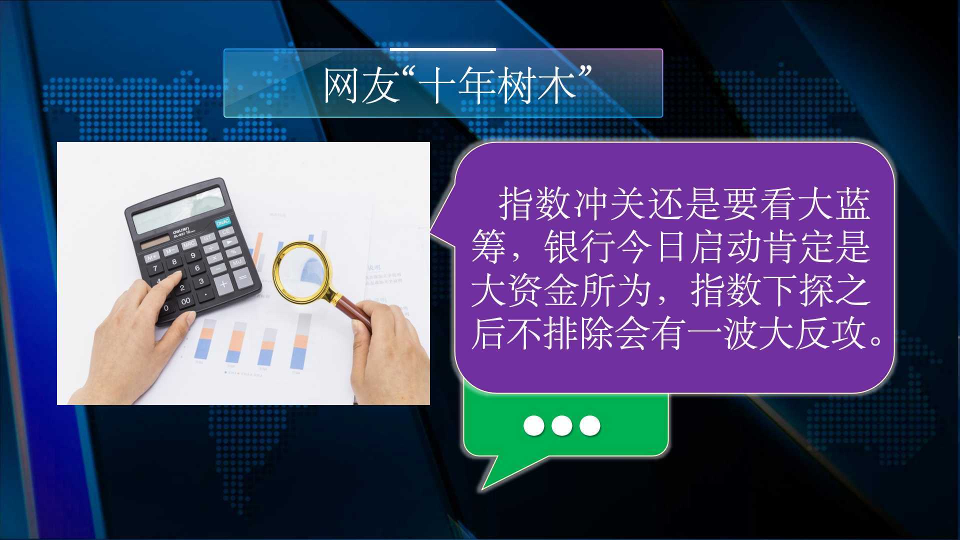 网友“十年树木”:指数冲关还是要看大蓝筹,银行今日启动肯定是大资金所为,指数下探之后不排除有一波大反攻。