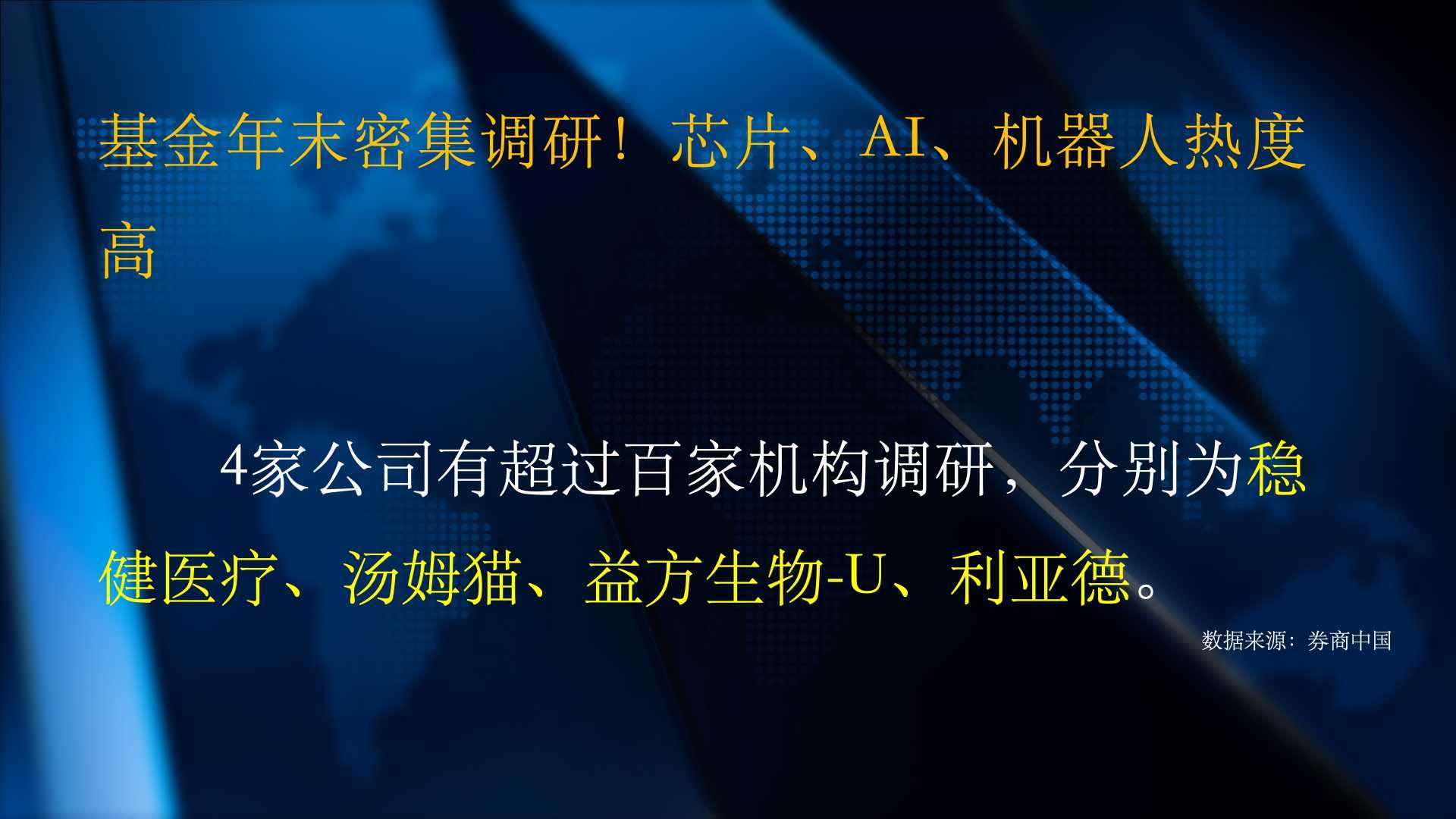 近日,数家公募基金公司扎堆调研上市公司,挖掘潜在跨年行情投资标的。4家公司有超过百家机构调研,分别为稳健医疗、汤姆猫、益方生物-U、利亚德。