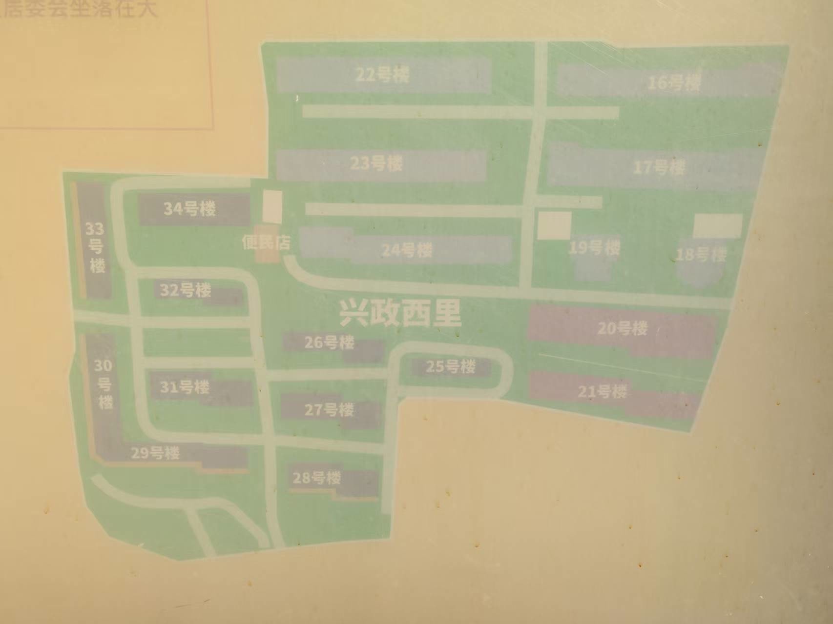 兴政西里社区内的指示牌比较少,仅有的几块标注也不是很清晰。18号楼前的一块指示牌已经非常模糊,而且缺乏对出入口的明确标注。