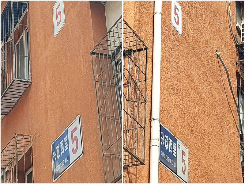 兴政西里5号楼和甲5号楼分居东西又紧密相邻,外观几乎完全一致。外卖员小梁停在两楼之间,看了看西、又看了看东。两栋楼都有白底红字的阿拉伯数字“5”标牌,一模一样。数字标牌下是标准楼牌,一个是兴政西里5,一个是兴政西里甲5。“甲”的字号明显比其他字小,需要仔细辨认。小梁确认自己送的是5号,才向东拐弯。