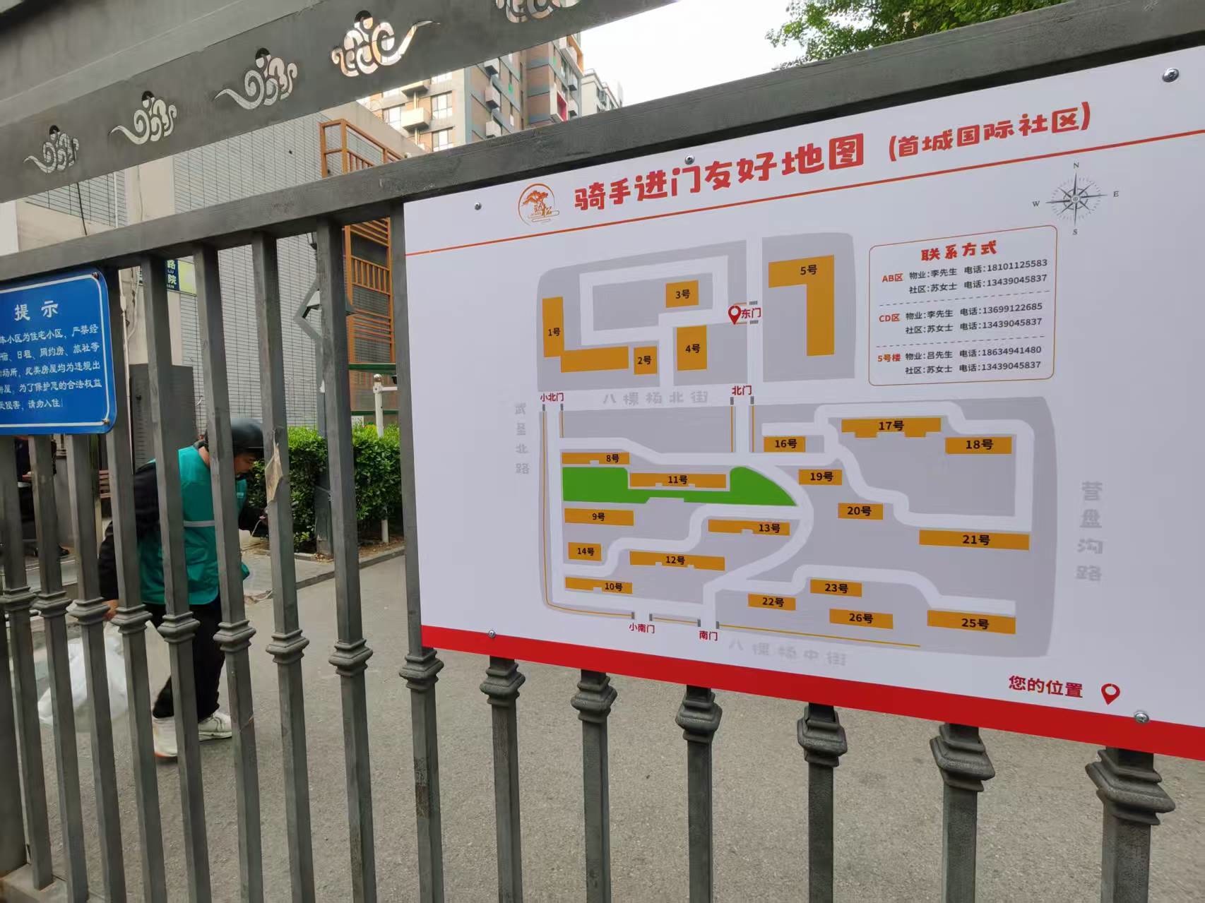 同时,也有小区正在想办法实现与外卖员的“双向奔赴”。在首城国际A区东一门,最近张贴了一块骑手进门友好地图,将首城国际所有楼栋位置和就近的出入口都标注得清清楚楚。有了它,外卖员一抬眼就能清晰地知道送餐路线。地图上甚至还留下了小区各个片区物业和社区负责人的手机号,方便骑手有急事联络。