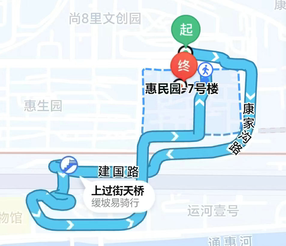 记者用共享单车重走了老张的送餐路线,从导航地图上看,路线曲折,好似中国结。骑行开始,向东离开力源里北街,再转向南进入康家沟路,没骑多远就进入地下通道。从地下通道出来,上了建国路向西骑行。到一处过街天桥,上桥推行,再转向南过桥,下桥后经过一个S形弯,进入匝道,开始爬坡。在匝道上向东骑行,再转向北,就能看见惠民园的居民楼了。骑行过程中,不断有外卖员从身边疾驰而过。导航预计骑自行车耗时13分钟,但因为弯道众多需反复确认,加上推车上下天桥的时间,实际耗时约20分钟。