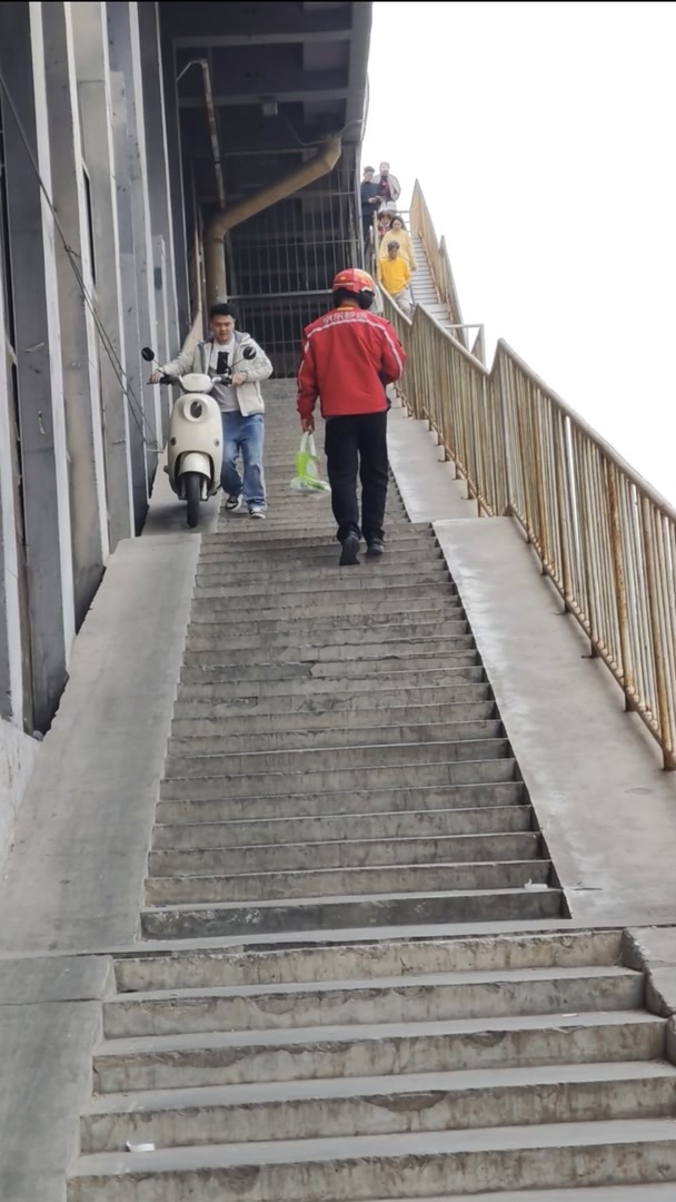 站在楼梯下,看到外卖员、小区居民上上下下。有居民推着电动车,从高处往下走,他双手捏着刹车,小心翼翼挪步,刹车捏太紧车辆不挪窝,捏太松车辆往下出溜。这一路,谨小慎微,到达地面的时候,他自己都笑了,“没辙,不想绕路只能这么走”。