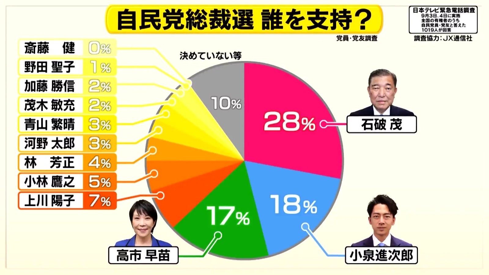自民党总裁选举定于12号发布竞选公告,27号举行投计票。截至8号,自民党已有6人正式宣布参选总裁。除石破茂、小泉进次郎和河野太郎外,前经济安全保障担当大臣小林鹰之、现任内阁官房长官林芳正和自民党干事长茂木敏充也加入选战。经济安全保障担当大臣高市早苗、前内阁官房长官加藤胜信分别定于9号和10号宣布参选。另有多人表达参选意向。