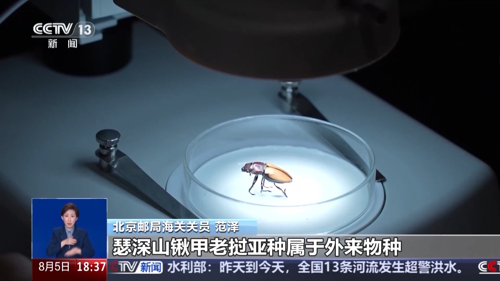 北京邮局海关关员 范泽:瑟深山锹甲老挝亚种属于外来物种,在我国没有自然分布,它的幼虫以腐败的木屑为食,成虫以吸食树汁或水果为食。此类外来物种,一旦(被)弃养或者逃逸,如果它们与本地近缘种杂交,会影响基因多样性。