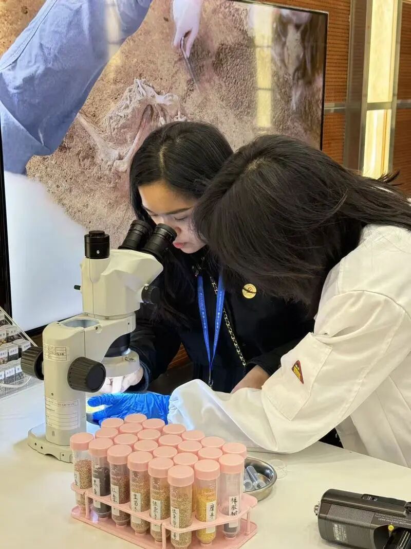 11月20日上午10点左右,在北京琉璃厂古文化街荣宝斋大厦二层的“指尖考古局”互动体验活动区,市民马女士正在科研人员指导下亲手触摸、观察琉璃河遗址出土的“粟”标本。“感觉非常好,平常很少有这样的机会能够体验到这种真实考古的感受。刚刚看了一下西周时期的小米和现在新鲜的小米的对比,就让我好像真实地触摸到了历史一样。”马女士说。