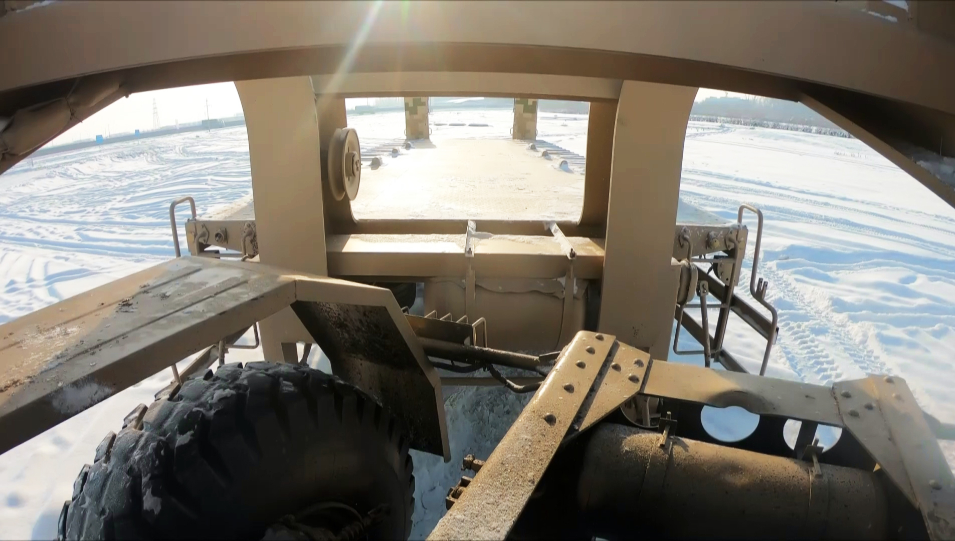 前方障碍是坡道起步,驾驶员要在上坡转弯45度的桥面,一边爬坡一边转弯,或许在春夏季节,这并不难,但看着桥面上的冰和雪,驾驶学兵们都知道,此时这个课目的难度有多大。