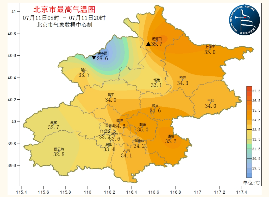 预计从7月13日至21日南郊观象台最高气温27~35℃,最低气温22~25℃。